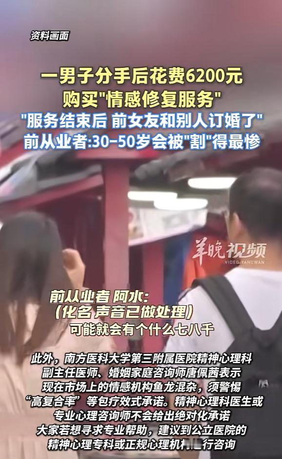“赔了夫人又折兵!”近日,广东广州,一男子分手后,为挽回感情,在一家公司花费6200元,购买“情感修复”服务,没想到服务结束后,他才得知,自己的前女友已经与别人订婚!男子这才意识到自己被骗了。网友:为爱情冲昏头脑! 这事的主角是小张,前段时间刚经历了一场分手,前任态度很决绝,这段感情说白了已经彻底走到头了,可小张就是钻了牛角尖,走不出来。 那段日子他浑浑噩噩,满脑子想的不是怎么放下、重新开始,反倒一门心思琢磨着怎么把已经“泼出去的水”收回来,人一旦陷入这种执念里,判断力就基本降为零,这也给了那些投机商家可乘之机,相当于主动递上了待宰的刀子。 就在小张一筹莫展、满心焦虑的时候,网上的情感咨询公司精准捕捉到了他的情绪,他漫无目的地刷手机时,一家声称能帮人挽回感情的咨询公司映入眼帘,页面上挂满了各种“成功挽回案例”,看得小张心潮澎湃。 那时候的他哪里还顾得上分辨案例的真假,只觉得这是能拉自己走出阴霾的救命稻草,满心都是抓住最后一丝希望,被情绪冲昏头脑的小张,当即就加了这家公司工作人员的联系方式,对方也是看人下菜碟,一眼就摸清了小张的迫切心理,立马推销起了“一对一情感指导”服务,一开口就是几千块。 为了挽回那段岌岌可危的感情,小张也是豁出去了,压根没犹豫,前前后后一共花了6200元,其中6000元都是买这项指导服务的费用,他把这笔钱当成了“赎回爱情的门票”,满心期待着奇迹发生,却不知自己已经踏入了一个精心设计的圈套。 本以为花了大价钱,能得到什么锦囊妙计,或是有专业导师手把手指点,可真正开始服务后,小张才发现根本不是那么回事,所谓的“情感修复”,简直敷衍得像应付寒假作业。 对方只是煞有介事地发来一堆不知道从哪拼凑来的资料,让小张照着学、做笔记、交作业,仿佛只要把这些理论吃透,前女友就会主动回心转意似的,实操环节就更离谱了。那位所谓的“情感导师”,除了让小张死磕资料,偶尔也就教他几句发短信的话术,让他给前任发消息试探。 一套流程走下来,理论讲了一大堆,可落到现实里,连一点水花都说不上,小张严格按照指导发消息,前女友那边要么毫无回应,要么干脆把他当空气,全程都是他一个人的独角戏,这拉锯战足足持续了一个月。 就在小张对着毫无进展的关系一筹莫展,还盘算着要不要继续花钱开启“下一步计划”时,一个晴天霹雳般的消息砸了过来,他偶然得知自己费尽心机想要挽回的前女友,早就和别人订了婚,人家早就放下过去,开始了新生活。 这个消息比分手本身更让他崩溃,所有的幻想瞬间化为泡影,那些所谓的情感修复、一对一指导、短信话术,在“前女友已订婚”这个铁一般的事实面前,全都变成了彻头彻尾的笑话。 他这才明白不是自己做得不够好,也不是话术不管用,而是人家早就彻底翻篇了,只剩他一个人被蒙在鼓里,在虚假的服务里像个小丑一样自我感动、被商家戏弄。 直到这时小张才如梦初醒,意识到自己是被那家情感咨询公司骗了,那些所谓的导师,根本没心思分析他和前女友的实际情况,不过是拿些通用资料敷衍了事,坐着就能把钱赚了,从头到尾都是利用他的失恋痛苦圈钱。 这事曝光后网上议论纷纷,网友们虽然同情小张的遭遇,但更多的是恨铁不成钢,直言他就是典型的“被爱情冲昏头脑”,本来分手是两个人的事,缘分尽了就该体面放手,可他偏要执着于虚无的希望,花钱买安慰,最后落得个人财两空的下场,还丢了体面,妥妥的“赔了夫人又折兵”。 其实市面上这种套路并不少见,都是抓住了失恋者脆弱无助的心理趁虚而入,感情里从来没有捷径可走,更不是花钱就能买回来的,如果对方真的铁了心要离开再贵的服务、再妙的话术也无济于事,小张的经历也给所有人提了个醒,陷入感情漩涡时,别让执念冲昏了理智,防范不靠谱商家的同时,更要管好自己那颗不肯放下的心,不然最后只会落得一地鸡毛。 (信息来源:《一男子分手后花费6200元购买“情感修复服务”,“服务结束后前女友和别人订婚了。”前从业者披露:30-50岁会被“割"得最惨。》羊城晚报)
