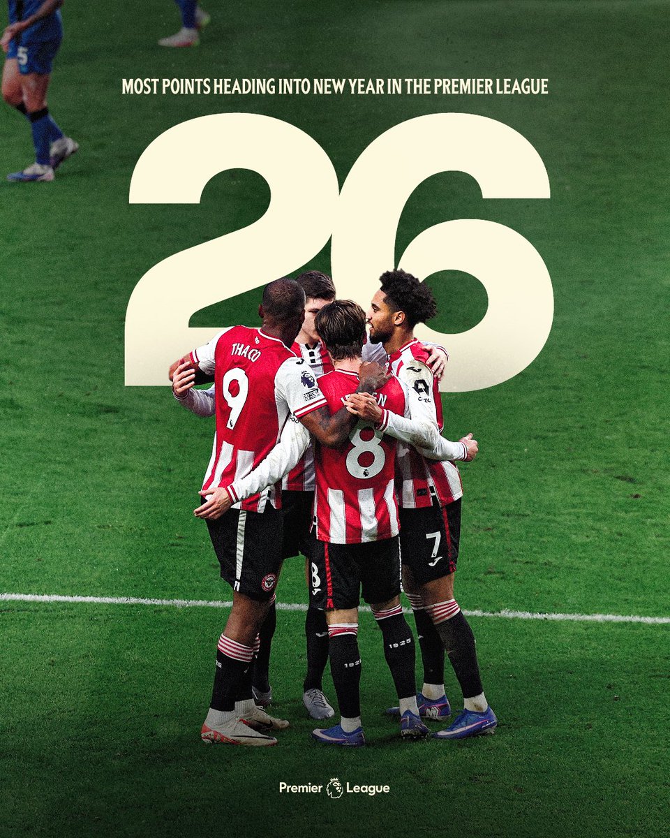 布伦特福德官方发布社媒:我们在英超联赛中取得了新年之前的最佳积分成绩。迎接2026年