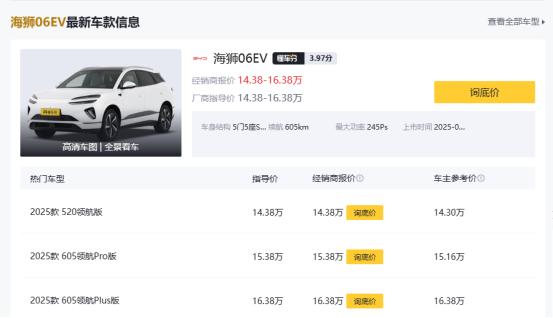 先把“总账”说清:同样605续航,起步价差挺明显,如果你奔着长续航去看,两台都有CLTC 605km版本。海狮06EV 605km版本指导价大概在16万级。但C10价格直降2万元,相当于直接省出一台家用充电桩的费用。你不要充电桩,你还可以买保险、甚至贴膜脚垫,都够你折腾一圈了。