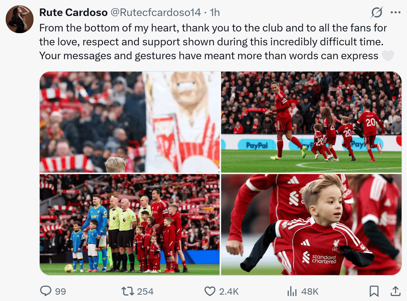 赛后,若塔的妻子Cardoso更新了社交媒体,发文向大家致谢。她的社媒配文这样写道:“谨以此心,感谢利物浦俱乐部以及所有球迷——在这段异常艰难的日子里,你们给予我的关爱、尊重与支持,我牢记于心。你们发来的每一条讯息、付出的每一份心意,都难以用言语形容其分量。”