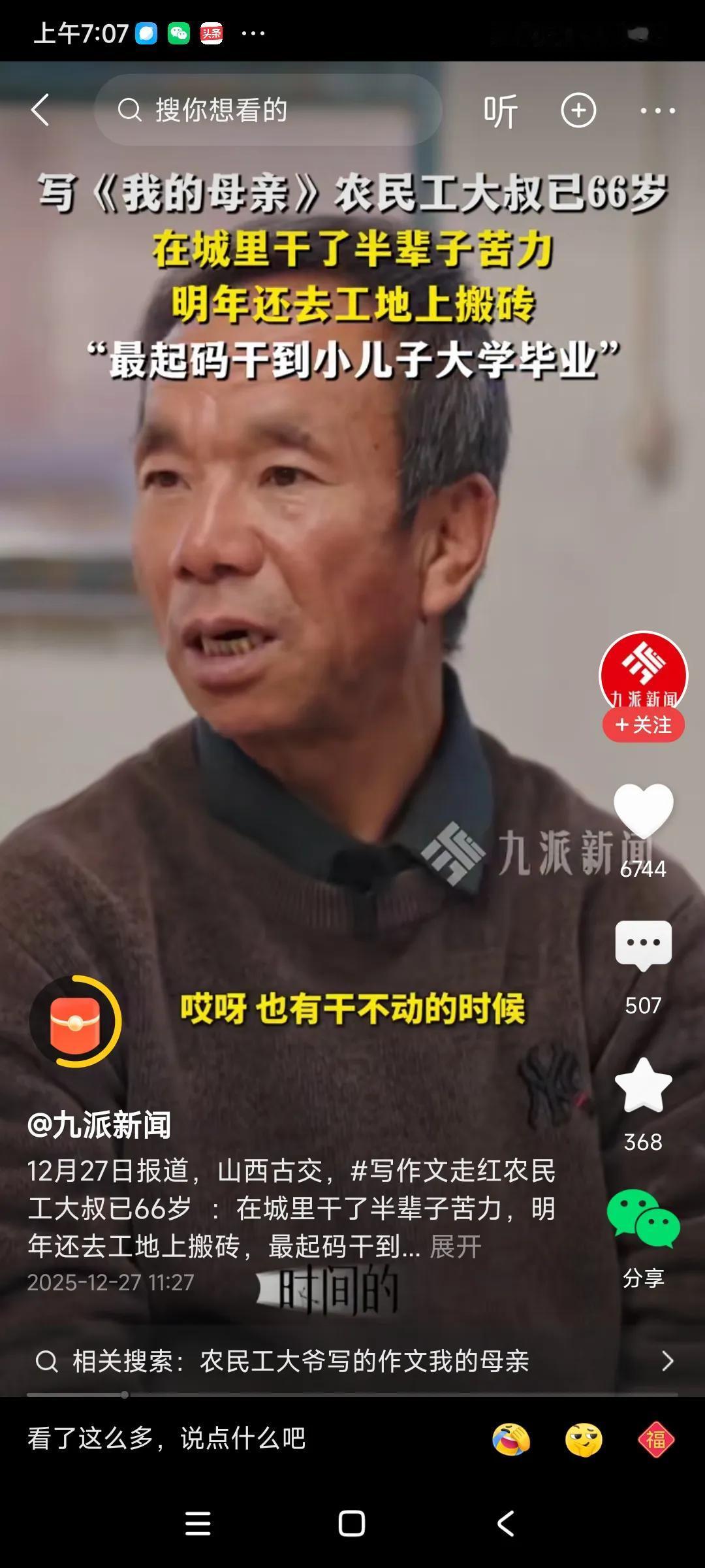 66岁大叔还要出去打工,而且是建筑业,最累的工作,,为小儿子挣大学学费,人生有些惨啊,,, 他这个年龄,城市里的人,不是打牌,就是跳广场舞,或者钓鱼,下棋了,,活得太累了,大叔还要继续工作,,真的不容易,,, 父爱如山,他这个小儿子真的要感恩啊,老人虽能能力有限,但他拼尽了全力,,透支了身体,真的为这个老人点赞,,