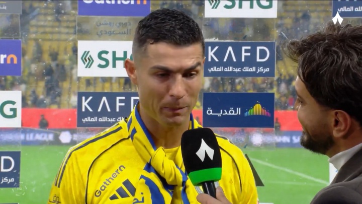 直播吧12月28日讯沙特联第11轮,利雅得胜利3-0击败阿科多,C罗独中两元,赛后他接受了媒体的场边采访。