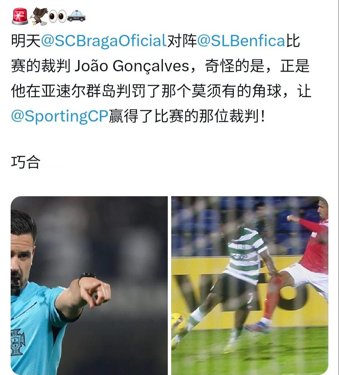 刚出两次事,没任何惩罚的葡萄牙体育御用裁判,将吹罚穆里尼奥本周的葡超联赛。这是干嘛?不敢让他再吹葡萄牙体育的比赛,怕整个联赛的球队抵制,不敢让他吹波尔图的比赛,因为对方是榜首,于是就来祸害本菲卡了。 来看看这哥们的破事,2025年11月10日,本菲卡对阵葡萄牙体育的葡超联赛比赛,补时阶段,葡萄牙体育享受了一把曼联的待遇,一个明显越过底线,属于本菲卡的球门球,若昂·皮涅罗(João Pinheiro)却给了葡萄牙体育角球,这是在吹罚比赛,还是在作为铁杆球迷看球,然后葡萄牙体育由昆达传中,助攻尤尔曼头球破门完成绝杀。‌ 2025年12月19日,葡萄牙杯对阵圣克拉拉的比赛,主裁判同样是若昂·皮涅罗,比赛争议焦点是,双方踢了9分钟,已经进入补时,然后VAR介入,花3分钟时间判了点球,让葡萄牙体育绝平,又补时了20分钟,直到葡萄牙体育绝杀。 话说这样的吹罚,这样的裁判,在葡萄牙足协承认错误的情况下,竟然没有任何处罚措施,或者说葡萄牙已经没有裁判了吗?不知道面对穆里尼奥这样的葡萄牙传奇,这哥们在背后没有阿涅利家族站台的情况下,敢不敢继续做出离经叛道的事情来。 哦对了,再发两个最新的处罚决定: 1. 根据葡萄牙足球联合会(FPF)纪律委员会(CD)本周六公布的纪律处分结果,本菲卡队因展示横幅(罚款 893 欧元),以及使用爆炸物或烟火装置(罚款 7010 欧元),而被处以罚款 。 2. 裁判法比奥·韦里西莫指控波尔图在其休息室的电视上,反复从多角度播放扬·贝德纳雷克对卢卡斯·霍尔尼切克的一次犯规,而正是这次犯规,导致裁判判定,波尔图由维克托·弗罗霍尔特打进的那粒进球无效。 面对这种威胁裁判,涉及到体育道德的行为,因为不知道是谁做的,没法给红牌,所以要从重处罚。波尔图方面不服,觉得罚的太多了,于是愤怒的表示,这个金额,比葡萄牙德比时,本菲卡球迷冲进场内,罚的都多。