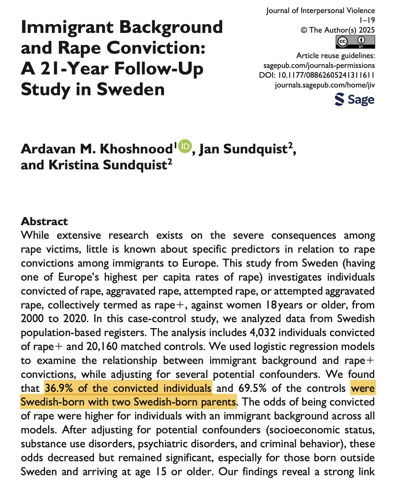 瑞典是欧洲强奸率最高的国家之一。但这篇2025年发表的研究强奸犯的论文被瑞典政府给审查了!¹ 因为这篇论文研究发现,过去20年居然多达2/3的强奸犯都是一代或二代移民!特别是15岁以上才移民过来的。论文得出结论:“在所有模型中,具有移民背景的个体被判定犯有强奸类犯罪的几率更高。”² 结果瑞典教育部就审查它,认定论文:“未能充分评估关于移民强奸的研究如何减少排斥并改善移民融合”。这不就是掩耳盗铃吗?科学人医疗社会史