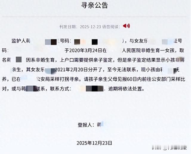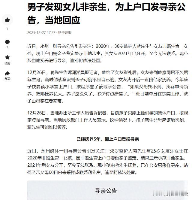 湖南永州,蒋先生经人介绍和乐女士相识恋爱,给了彩礼后乐女士就搬来同居,同居半年乐女士生下女孩,蒋先生因相处时间短早怀疑孩子非亲生,但为家庭没声张。可乐女士生完孩子还和前男友联系,两人常因琐事争吵。乐女士扔下孩子走了,蒋先生联系不上她,去娘家找,她父亲只说去了外地,蒋先生一家抚养孩子5年,孩子要上小学,上户口做亲子鉴定,结果孩子不是蒋先生的,蒋先生发寻亲公告,希望找到孩子父母,找不到就领养。 (来源:扬子晚报) 蒋先生的生活,因为一段感情和一个孩子,有了翻天覆地的变化。 蒋先生到了适婚年龄,经人牵线搭桥,认识了乐女士。两人相处一段时间后,便到了谈婚论嫁的地步。蒋先生按照当地习俗,给了乐女士彩礼,之后乐女士就搬到蒋先生家,两人开始了同居的生活。 同居半年后,乐女士就生下了一个女孩,这本该是件大喜事,可因为蒋先生和乐女士相处的时间实在太短,从相识到孩子出生,满打满算也没多久,蒋先生怀疑这孩子不是自己亲生的。 但蒋先生想着,既然已经在一起了,孩子也出生了,为了维持这个家庭,他就没声张,把这份怀疑藏在了心底。 然而,乐女士生完孩子后,蒋先生发现她还在和前男友联系。这让蒋先生心里很不是滋味,两人经常因为这件琐事争吵。 每次争吵,蒋先生都很痛苦,对乐女士行为的不满,又担心这样下去会影响家庭关系。可乐女士似乎并没有意识到问题的严重性,依旧我行我素。 2021年,这一年成了蒋先生生活的一个转折点。乐女士突然毫无征兆地扔下孩子,一走了之。 蒋先生发现孩子被独自留下时,他赶紧联系乐女士,可电话打不通,消息也不回,蒋先生又跑到乐女士娘家去找。 到了乐女士的娘家,乐女士的父亲只是她去了外地,具体去了哪里,什么时候回来,一概不知。蒋先生无奈,只能先把孩子带回家。 从那以后,蒋先生就独自承担起了抚养孩子的责任,他一个大男人,既要工作赚钱,又要照顾孩子的吃喝拉撒,其中的艰辛可想而知。 蒋先生的父母看到儿子这么辛苦,也过来帮忙一起照顾孩子,一家人虽然日子过得有些艰难,但看着孩子一天天长大,心里也觉得欣慰。 就这样,过了5年。 2025年,孩子到了上小学的年龄,按照规定,孩子上小学需要上户口,而上户口就得做亲子鉴定。 蒋先生带着孩子去做亲子鉴定的时候,心里其实已经有了不好的预感,但当结果摆在面前,显示孩子不是他的亲生女儿时,他还是觉得难以接受。 蒋先生看着眼前这个自己抚养了5年的孩子,这5年,他付出了感情,孩子的一颦一笑都牵动着他的心。可现在,亲子鉴定结果却无情地告诉他,孩子和他没有血缘关系。 蒋先生陷入了两难的境地,他不知道该怎么办才好,思考再三,蒋先生决定发一个寻亲公告。 他在公告里说,自己抚养这个孩子5年,已经有了深厚的感情,现在希望能找到孩子的亲生父母,如果找不到,他就申请领养这个孩子,继续给她一个温暖的家。 公告发出后,引起了很多人的关注,大家都在为蒋先生的善良和担当点赞,也都在期待孩子能早日找到亲生父母。 乐女士作为孩子的亲生母亲,在孩子那么小的时候就扔下不管,自己一走了之,这种行为,实在是太不负责任了,简直枉为人母。 孩子是母亲身上掉下来的一块肉,她怎么能这么狠心呢?她有没有想过孩子以后的生活会怎么样?有没有想过蒋先生一个男人抚养孩子会有多艰难? 希望孩子能早日找到自己的亲生父母,让他们知道孩子这些年过得怎么样。如果实在找不到亲生父母,也希望蒋先生能顺利领养这个孩子。 毕竟这5年里,蒋先生已经和孩子建立了深厚的感情,孩子也离不开蒋先生。相信在蒋先生的照顾下,孩子一定能快乐地成长。 从法律层面看,乐女士的行为,可真是问题大了。她作为孩子的亲妈,根据《民法典》规定,父母对未成年子女负有抚养、教育和保护的义务。 可她倒好,孩子年幼根本没独立生活能力,她直接离开,还没做任何抚养安排。 要是她主观上就是故意遗弃孩子,那可就构成遗弃罪了。 遗弃罪可是要负刑事责任的,这就不是简单的道德问题了,而是触犯了法律。 蒋先生想收养这女孩,这也不是那么容易的事。 他得符合收养人条件才行,要有抚养、教育和保护被收养人的能力,没不利于被收养人健康成长的违法犯罪记录等。 而且,在孩子亲生父母没明确表示放弃抚养权,或者没确认他们遗弃孩子的情况下,蒋先生收养孩子是有法律障碍的。 直接收养的可能性太小了,毕竟孩子亲生父母还有抚养的权利和义务。 所以,这事还得先想办法找到孩子亲生父母,看看他们是什么态度,再做下一步打算。