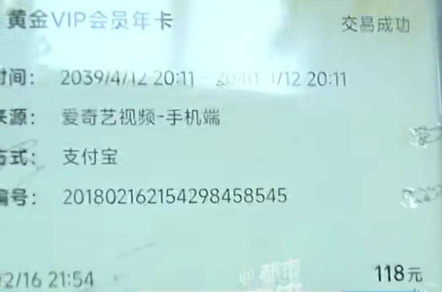 他表示,之前一直是家人在用,最近开始看剧才发现会员从2017年充到了2043年,“再怎么喜欢爱奇艺也不可能充20多年会员,房贷才30年。”
