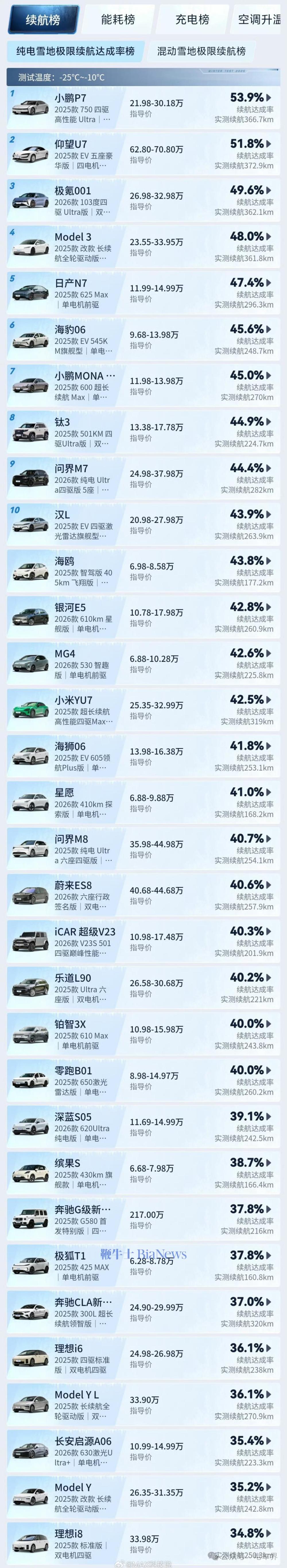 日前,汽车之家发布2025年度冬季测试结果,本次测试落地内蒙古牙克石,在-10℃至-25℃的极寒环境下完成,共围绕续航达成率、能耗、快充、空调、自动紧急制动(AEB)、加速、越野能力七大场景展开考评。