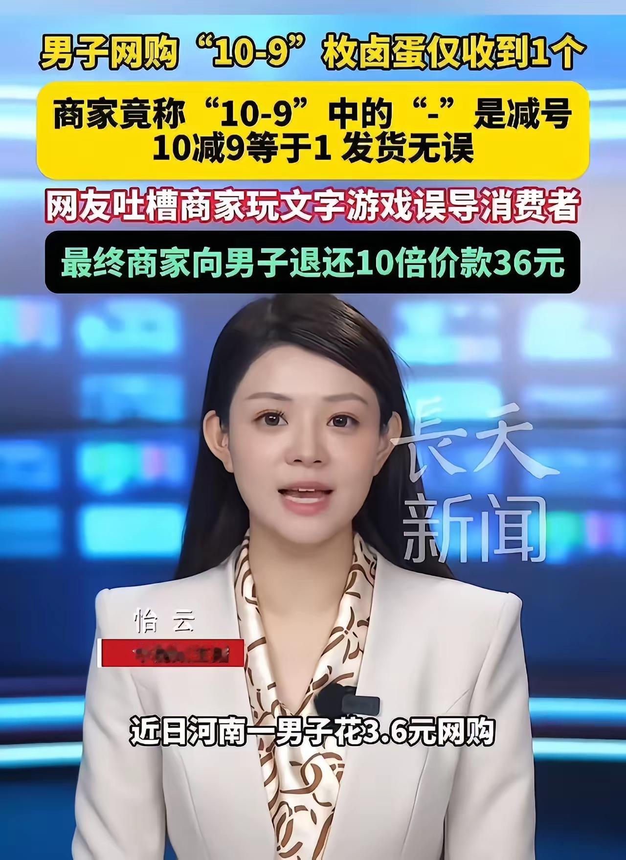 这件事反映了商业诚信的重要性以及“文字游戏”可能带来的误导与恶劣影响。具体来说,男子在购买卤蛋时,因为标注“10 - 9”而误以为能够收到10枚,结果只收到1枚,商家的解释竟然是“‘-’是减号,10减9=1”,完全忽视了消费者的理解和感受。 这不仅是个沟通问题,更是道德底线的问题。商家采用类似的“玩文字”的方式,试图误导消费者,从而获得不正当利益,损害了消费者的权益,也破坏了市场的诚信环境。公众对此非常关注,网友的嘲笑与批评也彰显了社会对这种不诚信行为的反感。 这件事提醒我们: 商家应诚实守信,避免用文字陷阱欺骗消费者。 消费者应理性辨别标识信息,遇到疑问应及时核实。 监管部门应加强市场监管,杜绝虚假宣传和误导行为。 市场的健康发展需要诚信为本,只有诚信经营,才能赢得长期的信赖与支持。 希望所有商家都能以诚信为原则,真正为消费者提供优质的商品和服务,共同营造一个公平、有序、可靠的市场环境。商业代言风险 文字游戏陷阱 商业话术争议