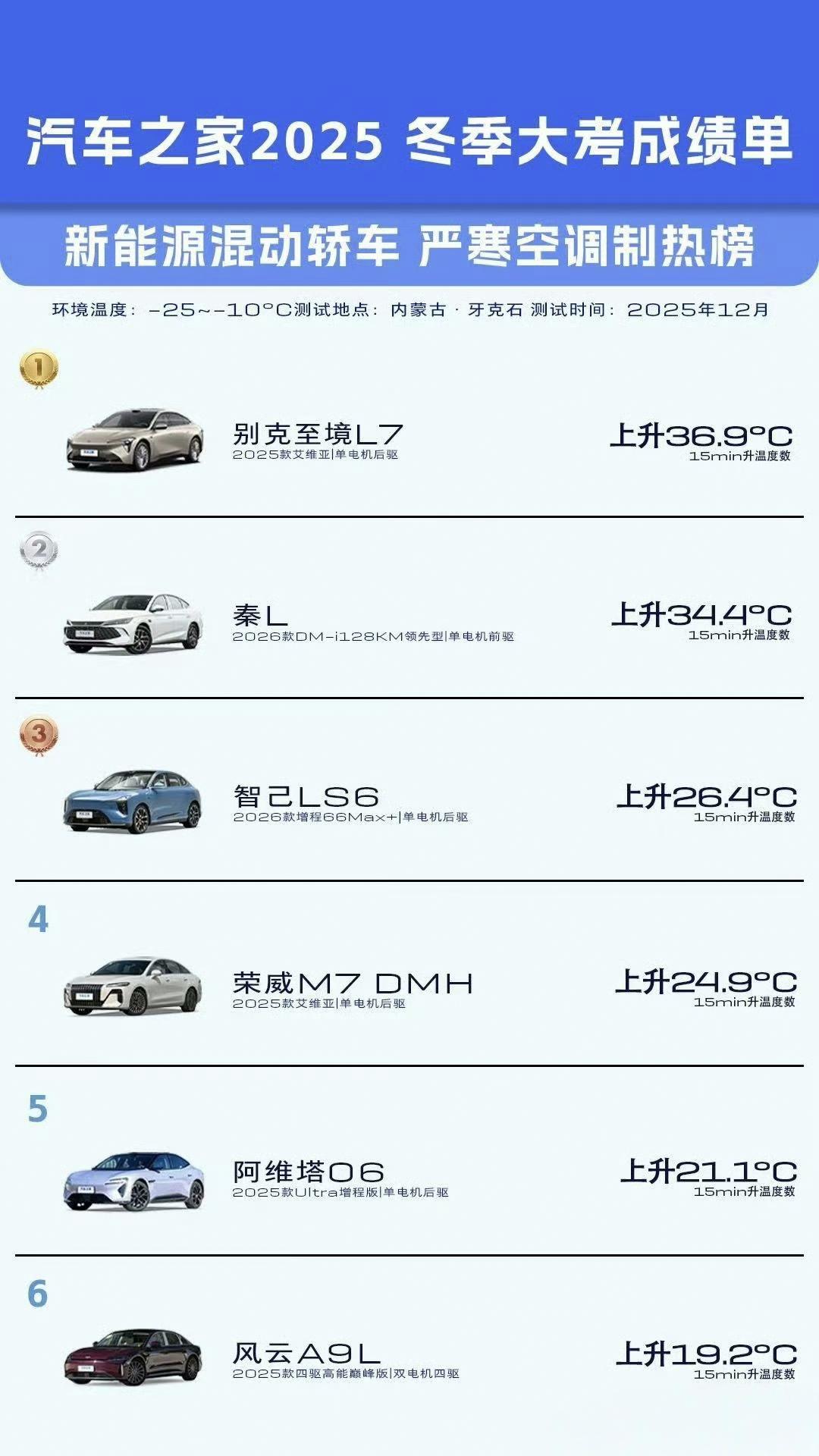 汽车之家冬季续航测试,别克至境L7表现还真不错。 续航达成率前三,超过50%的续