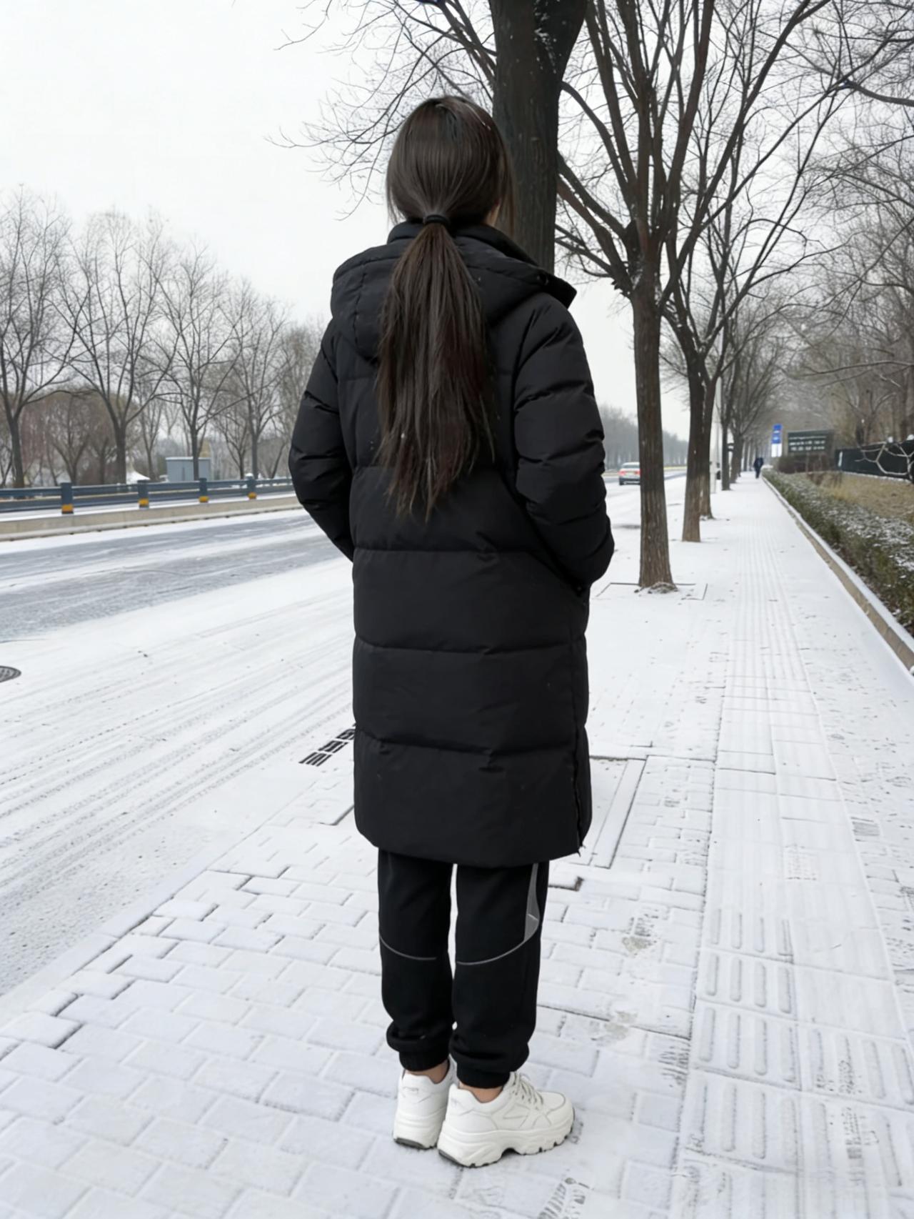雪落在路砖的纹路里 像时间按下的指纹 白羽绒服鼓起蓬松的云朵 长发垂落,是黑夜遗落的河流 ~ 脚步碾过薄雪的声响 轻得像一句未说出口的话 树桠裸着枝骨,伸向天空 如同我摊开的掌心,空荡又执着 ~ 黑羽绒服裹住冬日的风 背影是一枚拧紧的墨色印章 盖在雪地上,没有落款 只有白鞋尖挑开的雪沫 一点一点,飘成了星子 ~ 雪地上的脚印一串又一串 像未写完的诗行 每一步都踩着清冷的光 背影朝着远方 一路向前 把冬天走成了寂寞悠长的雨巷
