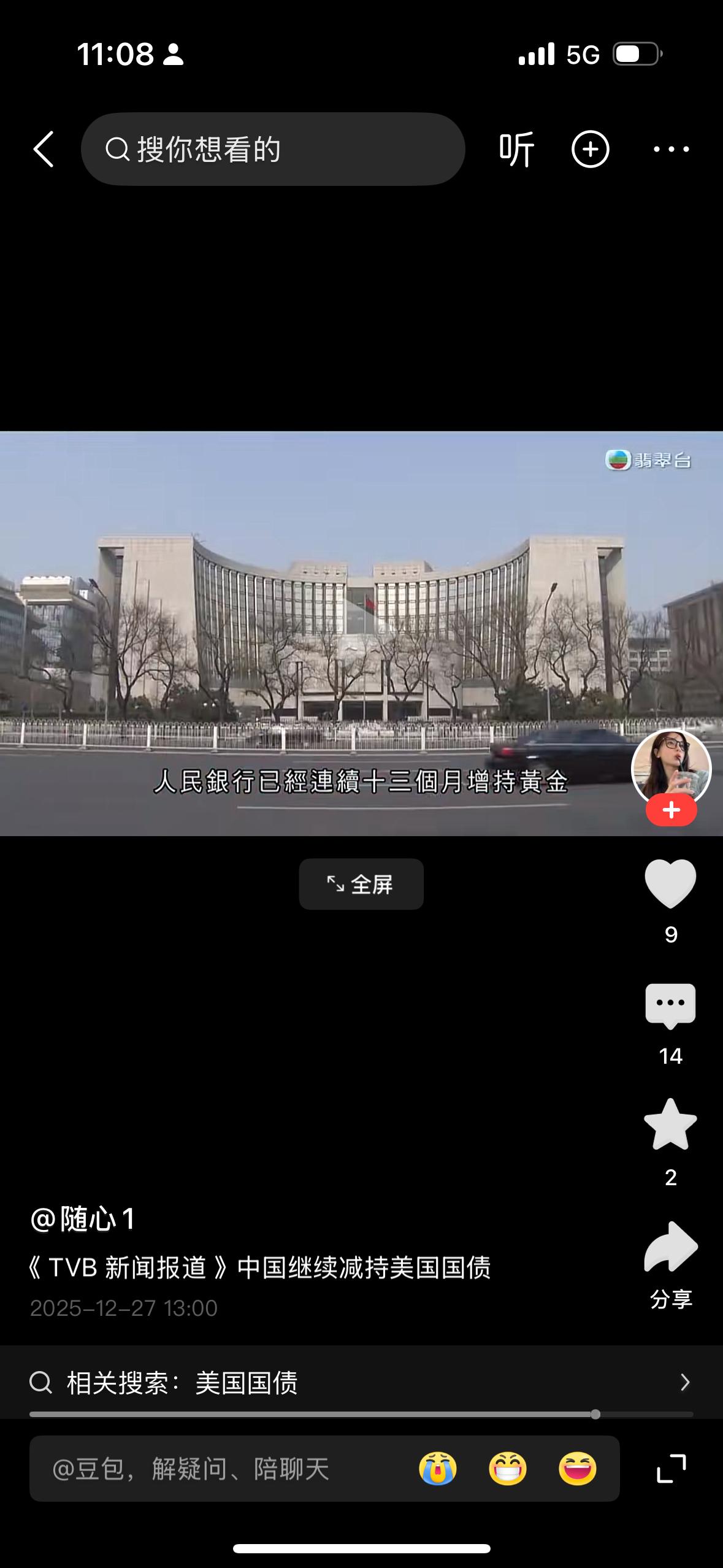 根据TVB新闻报道,中国再次减持美国的国债增加黄金储备,中国的美债已经从巅峰期的1.3万亿美金下降到现在的6887亿美金,我觉得我们政府的政策是正确的,为什么要买你美国这么多国债给你钱用呢?我们应该把这个钱拿回来发展我们本国的经济提升我们的国家军事实力。