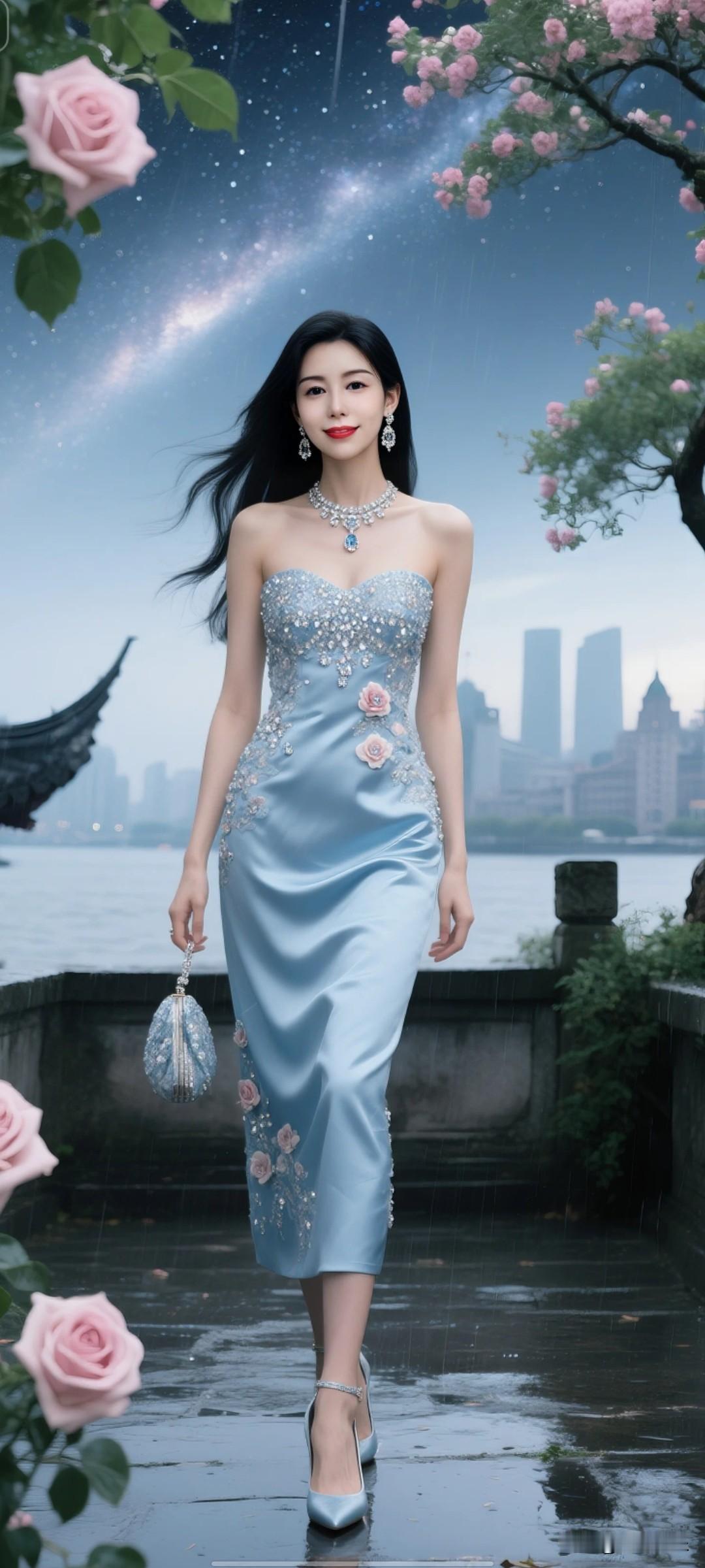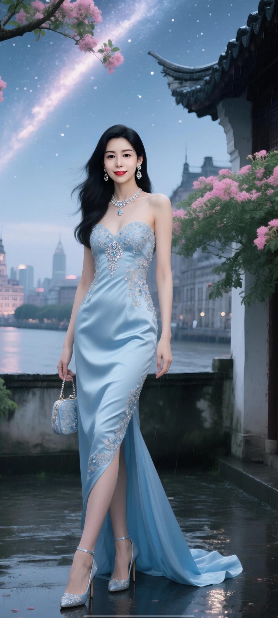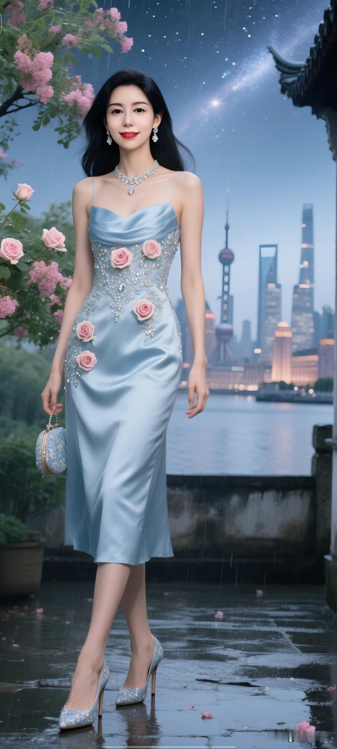 什么样的女人算自然美时尚美女,穿着精致制作的服装淡蓝色,品质服装搭配,完美身材比例,身高1.7米,模特正面照,百花齐放精致工艺,将小玫瑰花的意象栩栩如生地呈现在服装之中。礼服裙,同款高跟鞋,棉布,真丝,缎面,立体剪裁,刺绣,钉珠,布艺,高级珠宝,手包,黑色长发飘飘,淡蓝色,粉色,背景是横亘星河,纵览人间。,一个美女,肌肤细腻白皙。长发飘飘,完美身材比例,身高1.7米,耳饰、颈饰及身上的服饰也都镶嵌着大量闪亮细小的钻石。超高清画质,璀璨夺目的视觉效果,人物特写,全身照,同款高跟鞋,远景,9:16,背景是上海:浦江潮起,万国风华;十里洋场,万象新生。,美女个子挺拔,1.9米个子,倾国倾城,国色天香,花容月貌,靡颜腻理,明眸皓齿,千娇百媚,丹凤眼,眉角细长,鼻子力挺,淡妆艳抹,冷白皮,白皮肤,厚涂特写,半扎发长卷发,充满潮流元素,时尚潮流风,时尚引领的自信感,展示整体穿搭,突出潮流感,刚下过雨的天气,古建筑的庭院,晨起的微微的光线,房屋一角有茂盛的绿色叶子粉红色合欢花的树,树枝在微风吹拂下轻轻摇曳,画面谁美,高清,冷色调