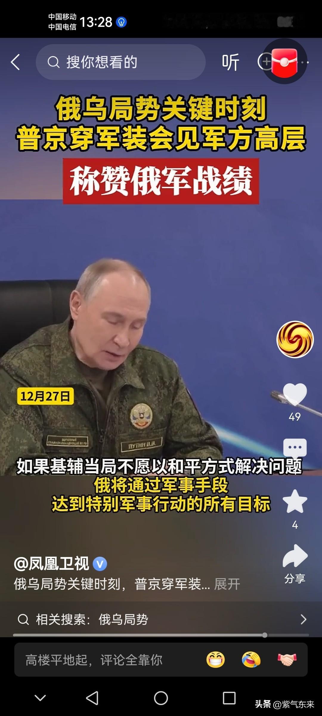 普京罕见穿军装视察前线部队,并听取军队高层的的汇报,意图很明显! 乌克兰不愿意和谈,那就打到乌克兰愿意和谈为止! 并表态:如果基辅不愿意和谈,不愿意以和谈的方式解决问题,那就通过军事手段达到战略目的!留给乌克兰时间不多了! 普京表示很惋惜,乌克兰不愿意接受西方聪明人的建议,不愿意接受和平条款,不着急结束战争,那就奉陪到底! 目前俄罗斯明显加强了对乌克兰的攻势! 乌克兰也想谈,但是涉及主权领土问题,肯定不会让步!如果泽连斯基让步,那就乌克兰的罪人!况且打了这几年,兵源越打越少,国家经济全靠援助和贷款,也是着实不甘心但又无可奈何! 泽连斯基心里也清楚,领土拿不回来,但是也不能这么草率结束!
