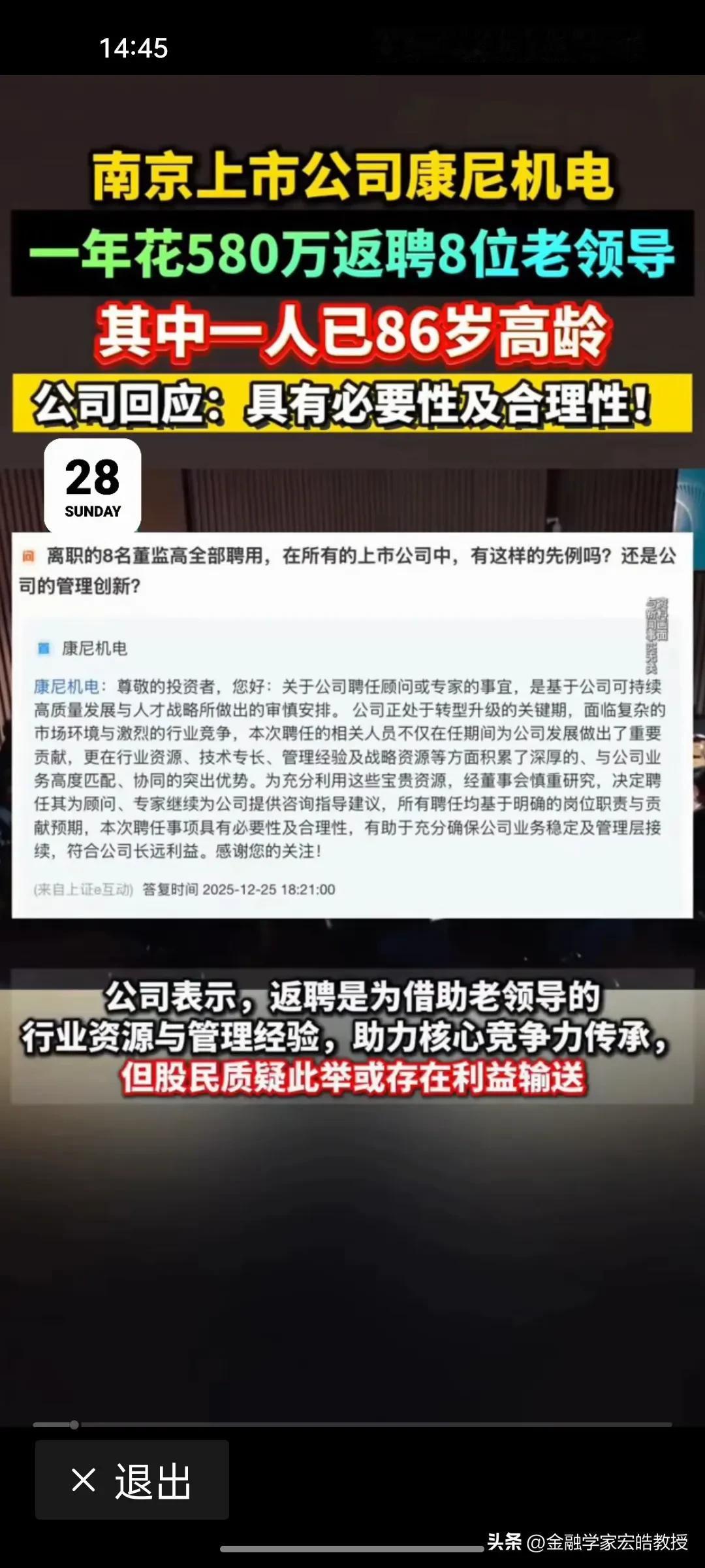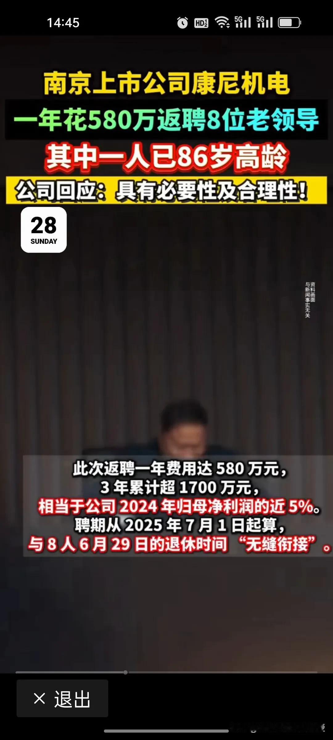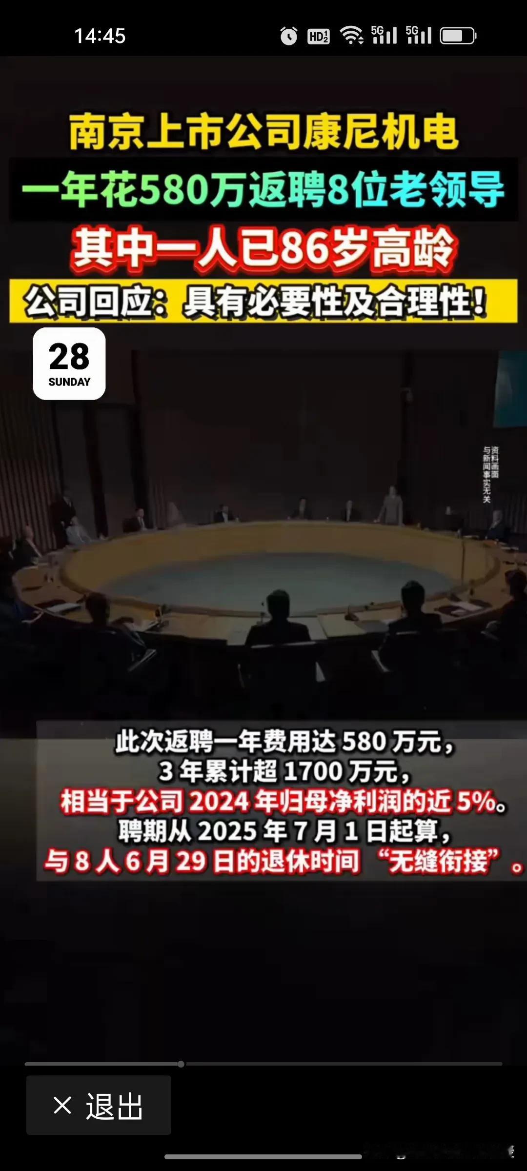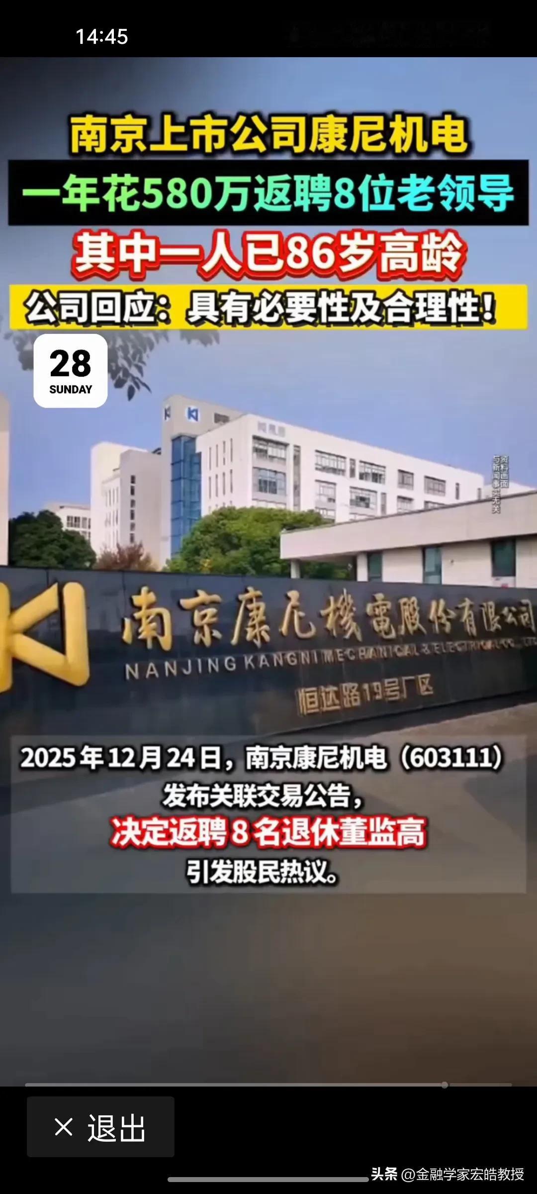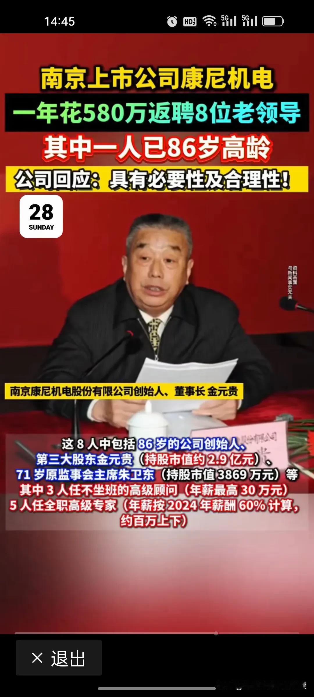 康尼机电580万返聘8位老领导,真相到底是什么? 南京康尼机电豪掷580万返聘8位退休老领导,其中含86岁创始人金元贵(持股市值2.9亿)。3年费用超1700万,平均每个人3年能拿212.5万,占2024年净利润近5%。公司称是必要且合理的,是为借行业资源与经验助力发展,却遭股民质疑存在“利益输送”。 究竟是为扩大资源拿订单、提升企业效益,还是另有隐情?公司需直面中小投资者质疑,把返聘薪酬标准、履职考核等细节讲清楚,才能打消市场顾虑!