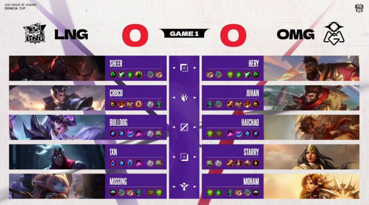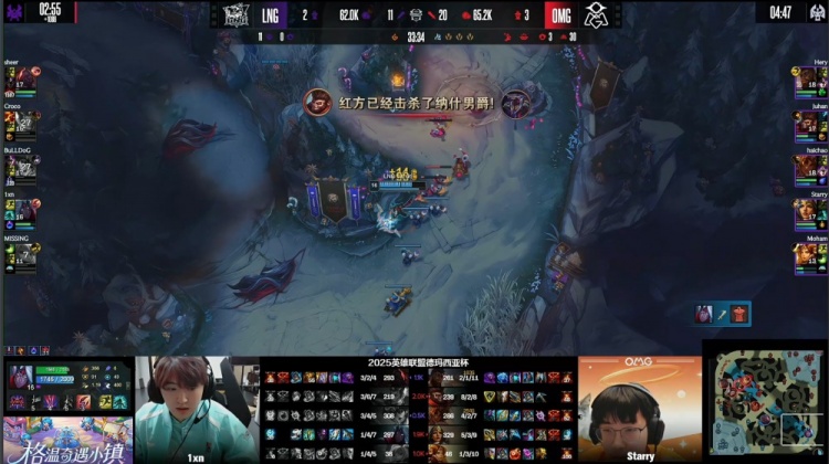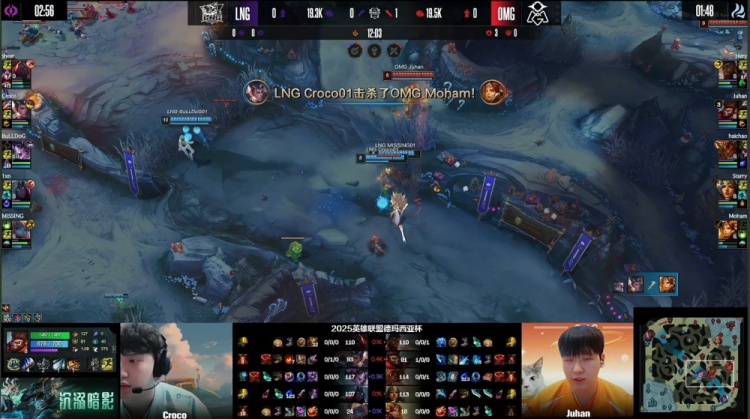 [25:28]小龙团,Croco赵信与队友脱节开大进龙坑闪现过墙拉开,正面Missing波比锤飞Moham女坦,Juhan拿到小龙后击杀Missing,haichao岩雀独自开车进LNG人群送BuLLDog人头,1xn韦鲁斯输出击杀Hery,Starry希维尔反手双杀收割,Juhan猴子战至最后,OMG打出4换5团灭LNG,经济领先2k,OMG听牌土龙魂。