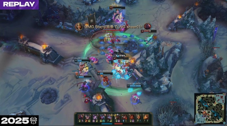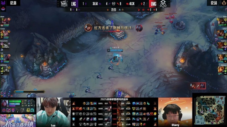 [34:17]sheer赛恩河道逛街被逮捕,OMG中路推进拔掉LNG二塔,随后冲上高地推掉LNG高地塔,正面团战,Starry先杀sheer,双方上单互换,1xn反手带走Moham拿到双杀,Croco赵信野区找haichao被后者拉扯单杀,双方打出2换2,OMG经济领先6k。