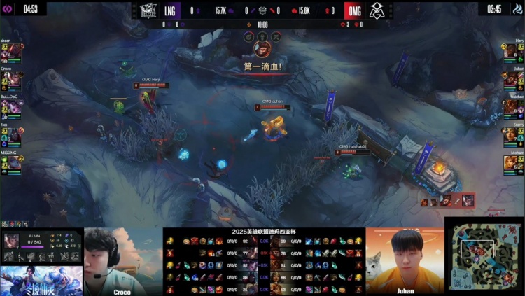 [10:05]Croco赵信河道被OMG三人前后包夹逮捕,Junhan猴子拿到一血。