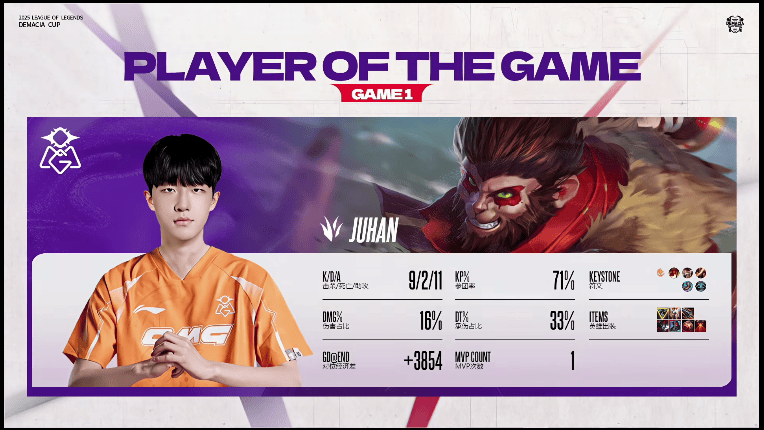 Juhan使用猴子打出9/2/11战绩,斩获OMG对阵LNG第一局MVP