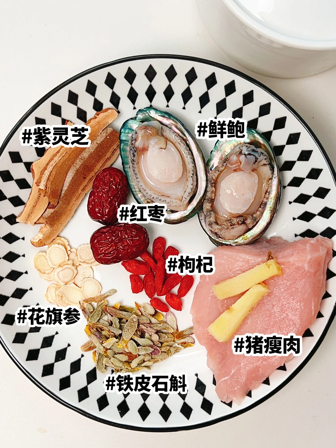 ▪️花旗参2g▪️铁皮石斛6g▪️紫灵芝5g▪️鲜鲍▪️红枣▪️枸杞▪️瘦肉300g