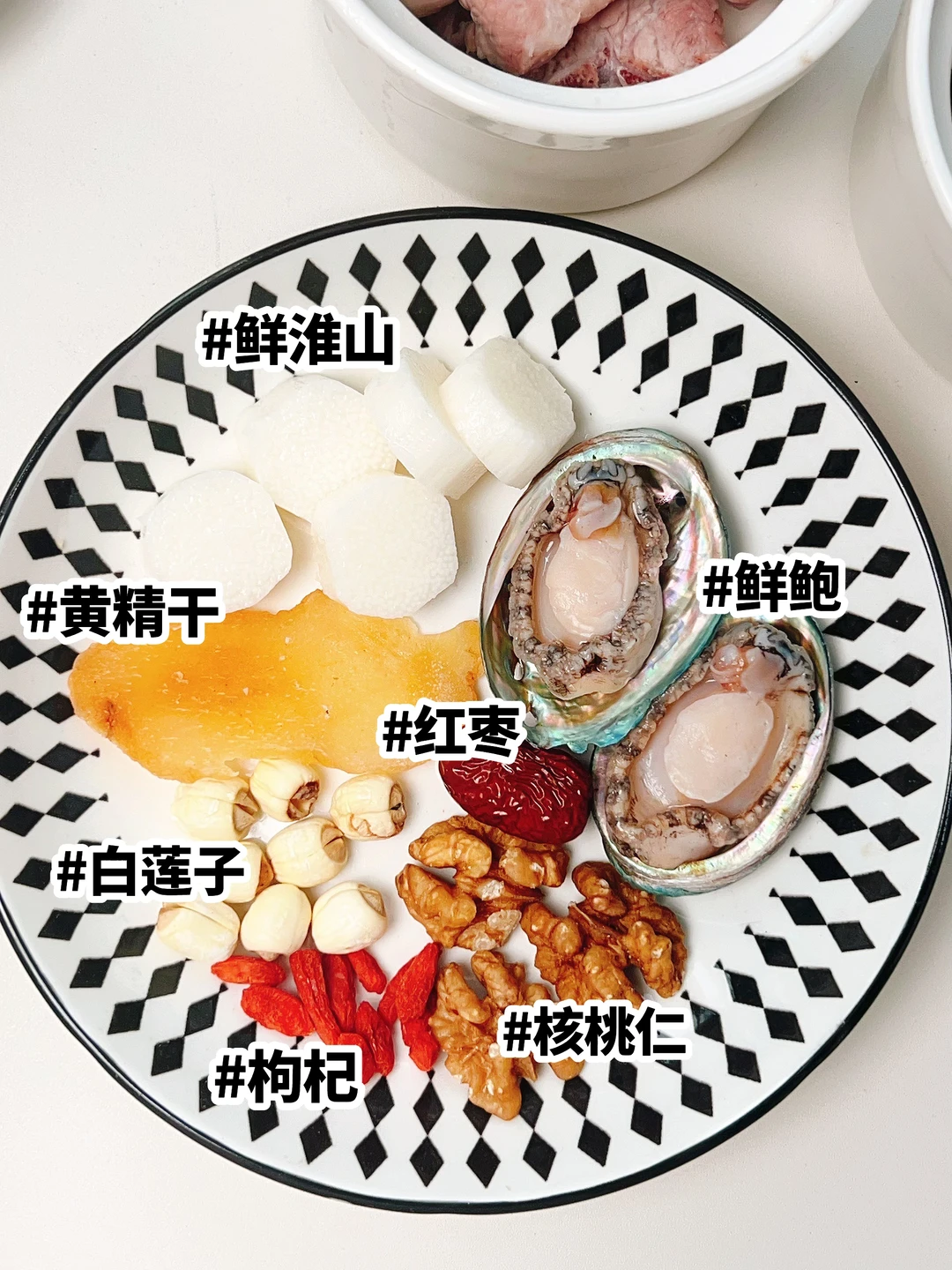 ▪️黄精干10g▪️鲜淮山100g▪️核桃仁5-6粒▪️莲子15g▪️红枣3-5粒▪️枸杞▪️鲜鲍▪️排骨300g▪️姜片