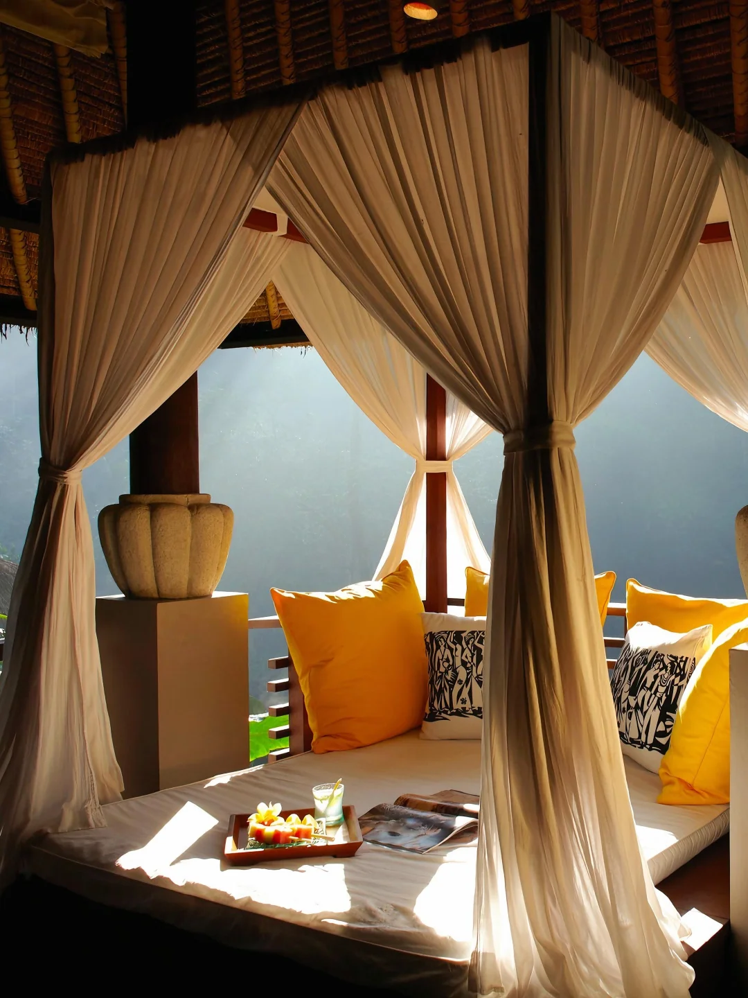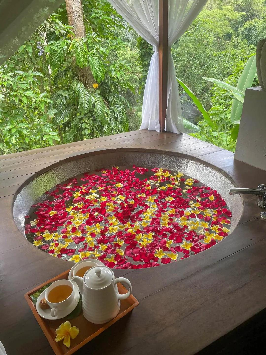 这家水疗中心坐落在乌布茂密的丛林中,毗邻宁静的佩塔努河,可以在浪漫的鲜花浴中放松身心,浴中装饰着多种色彩鲜艳的鸡蛋花,同时欣赏周围雨林山谷和下方流淌的河流的壮丽景色