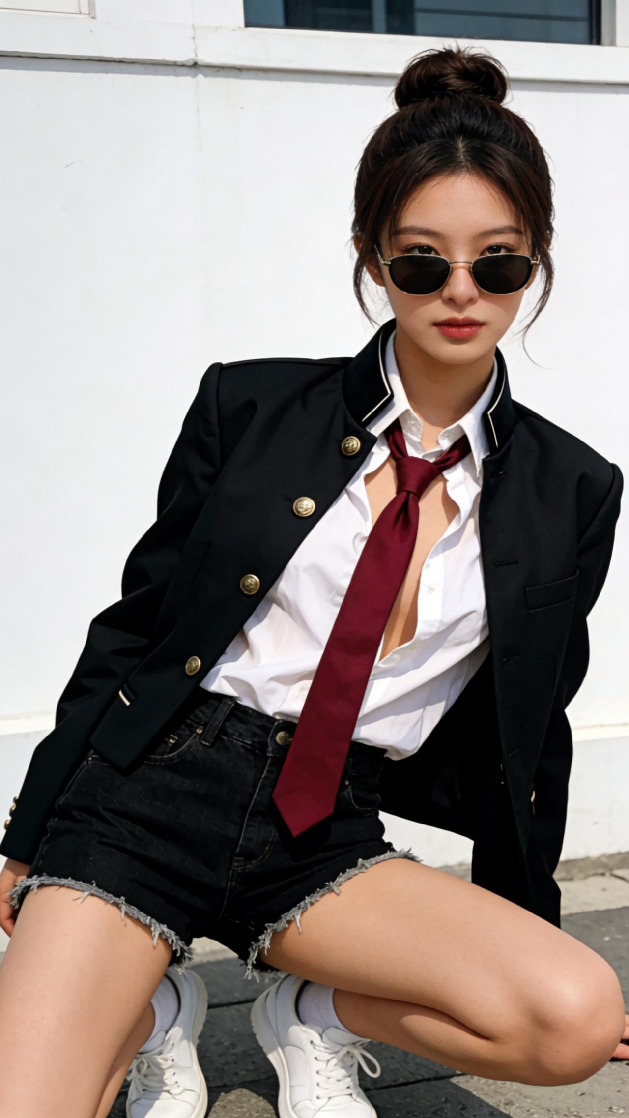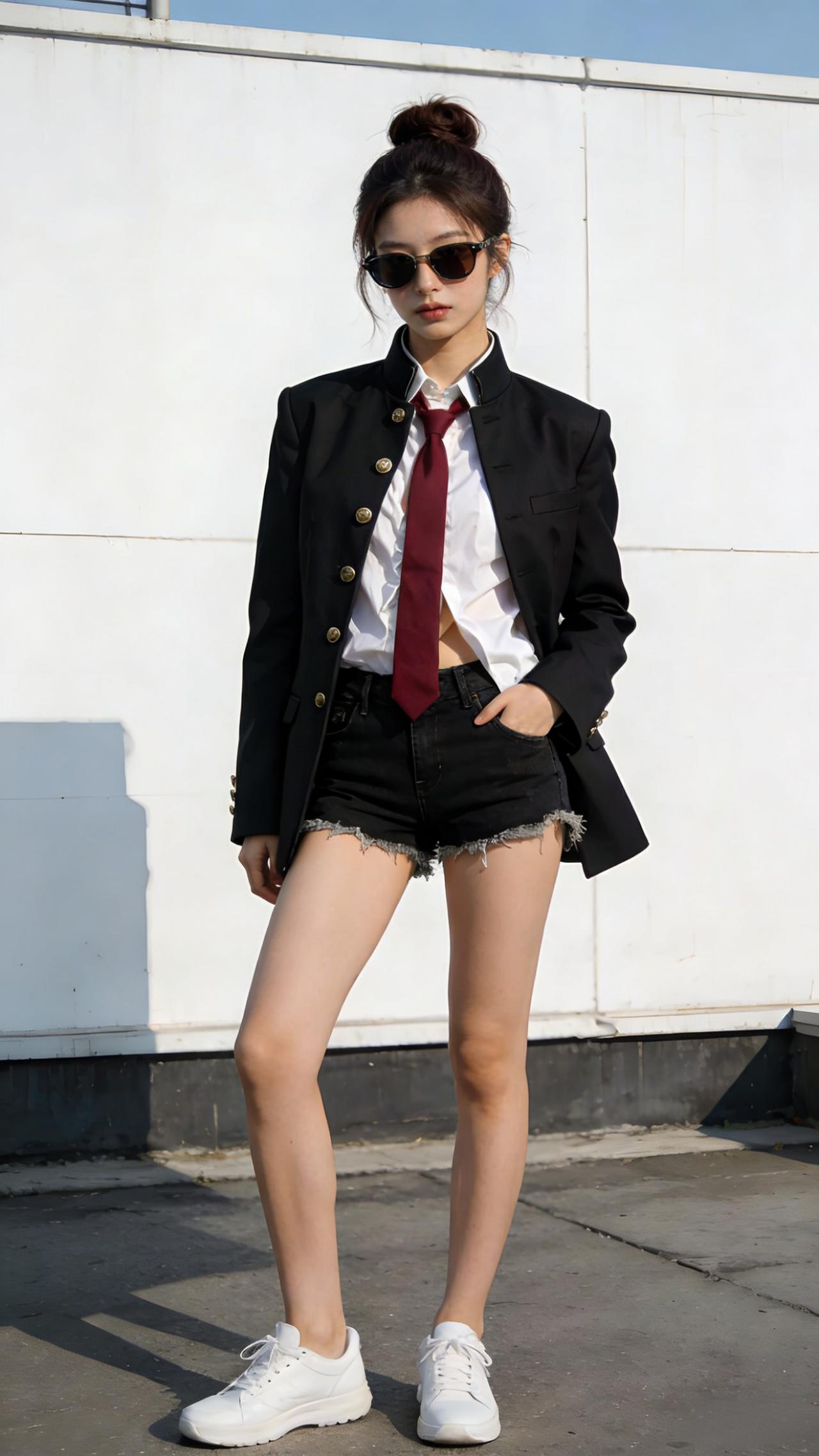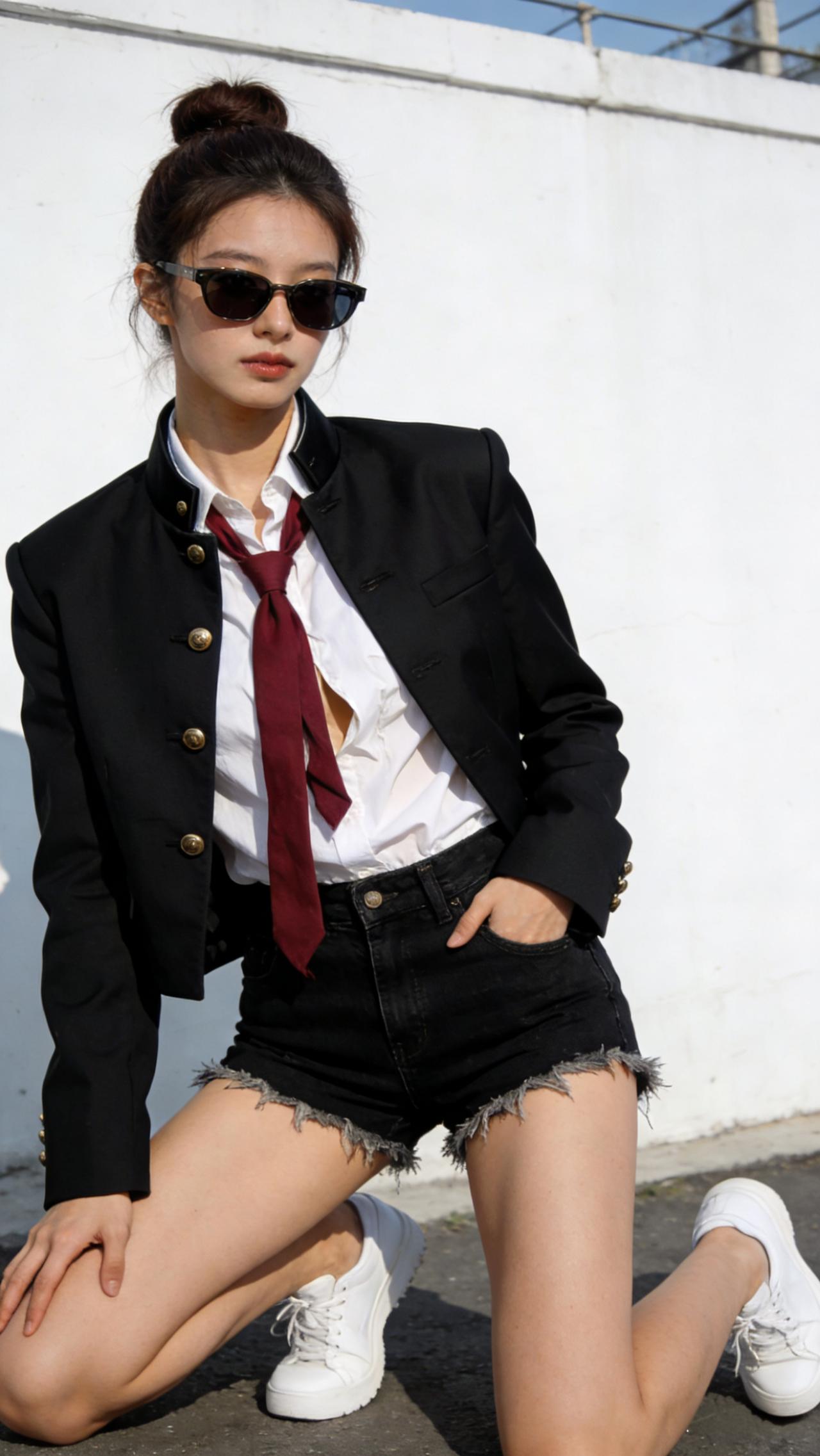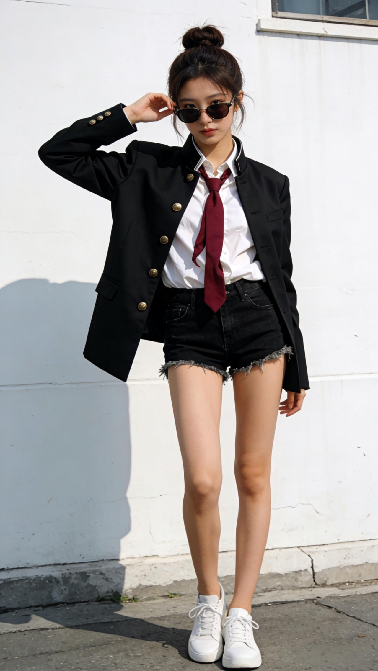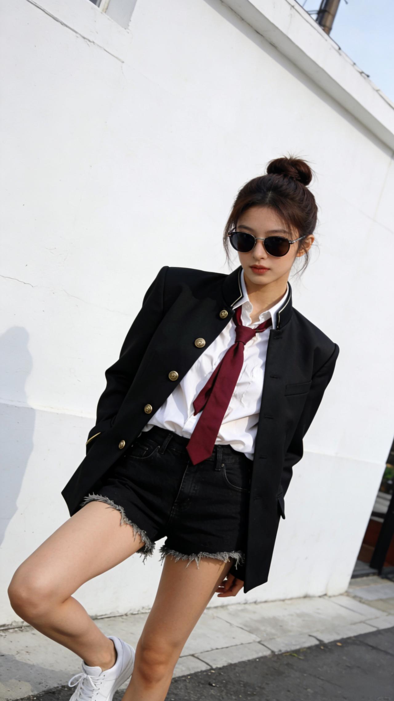 酷炫学院风穿搭,黑制服红领带与黑色短裤的完美搭配,尽显青春活力!😎👗👠有气