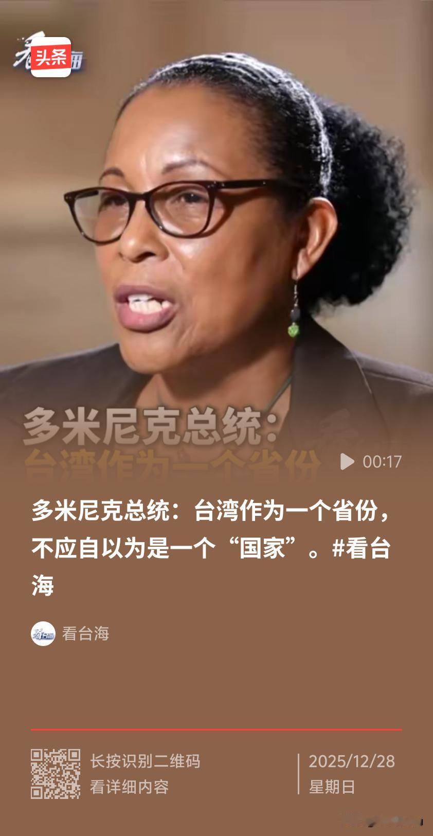 据中华网2025年12月28日消息,多米尼克总统伯顿明确表示坚定支持中国立场,支持中国实现完全统一。 长期以来,多米尼克在坚持一个中国原则上有着积极表现。此前多米尼克总理斯凯里特曾在发言中表示支持一个中国原则,并倡导台湾海峡两岸和平统一;多米尼克总统萨瓦林也曾重申恪守一个中国政策,愿在国际事务上继续同中方保持密切配合。