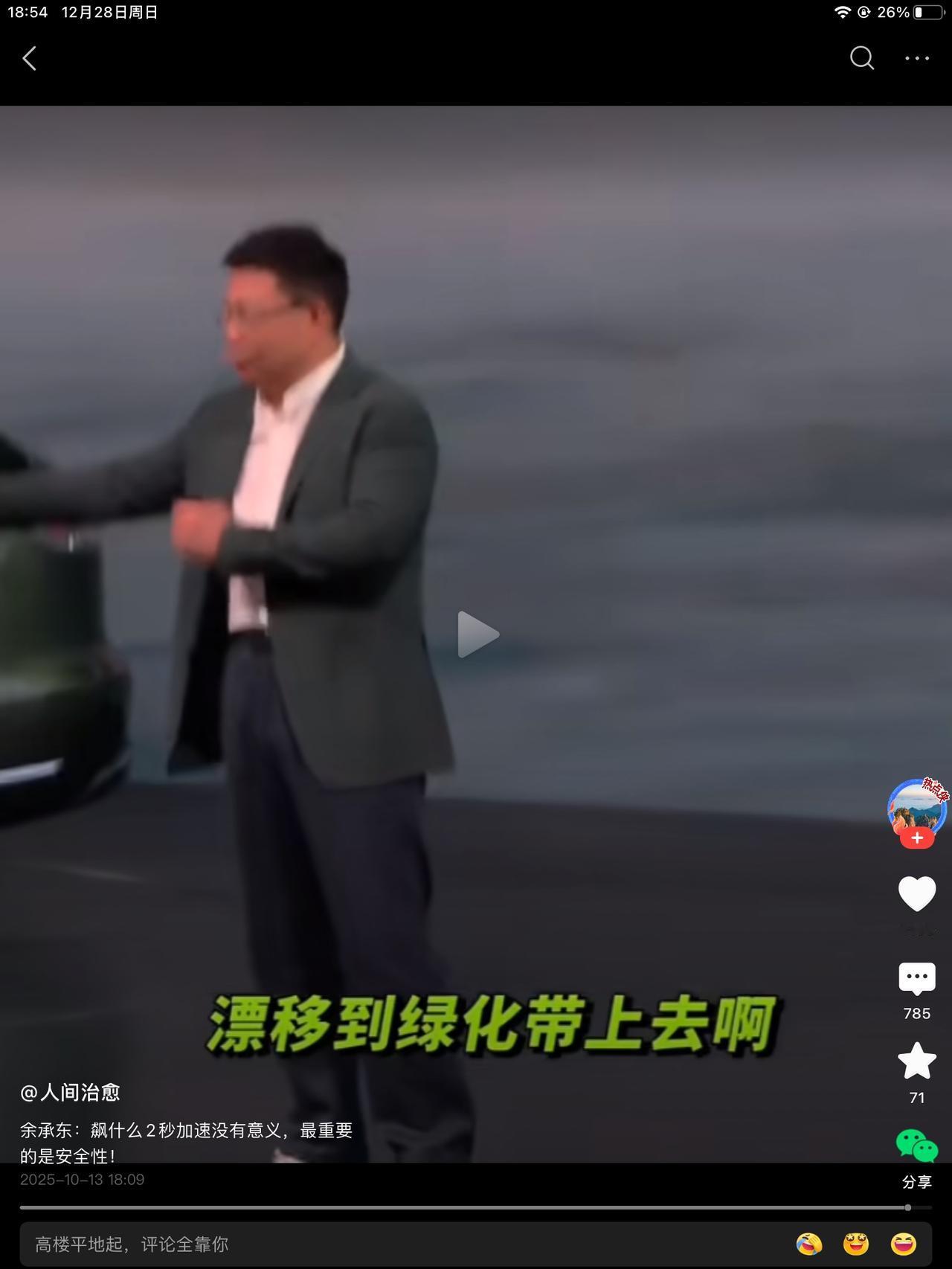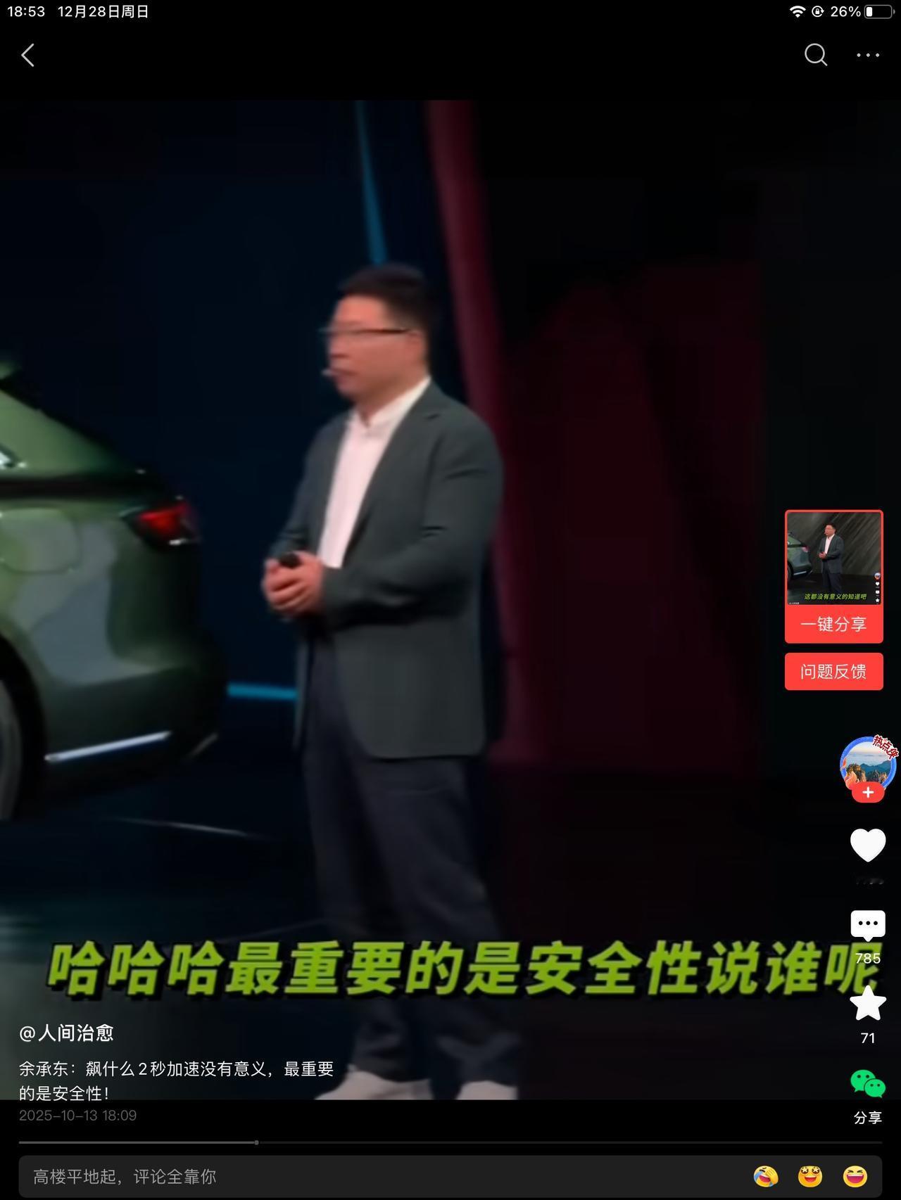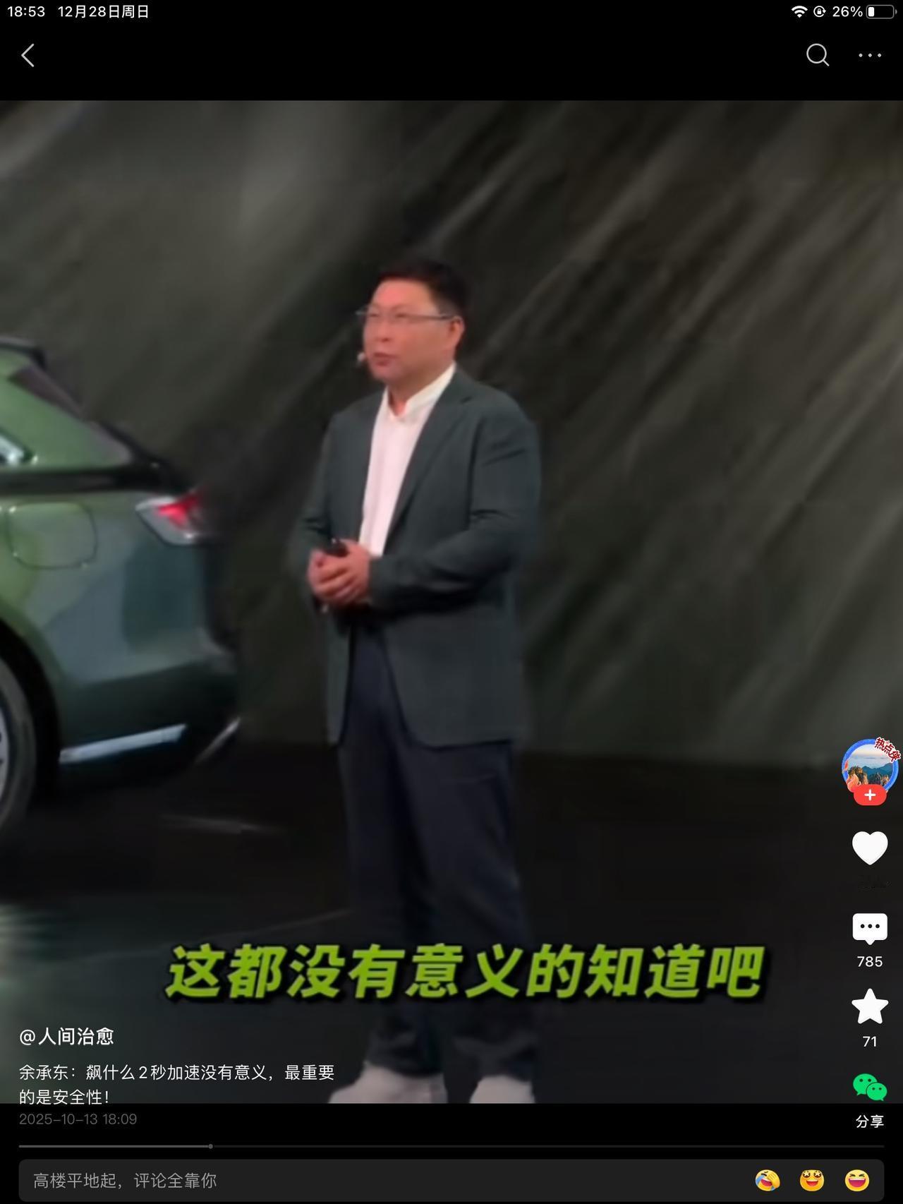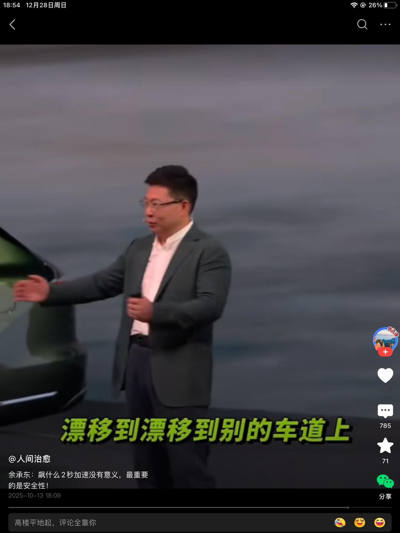 同行是冤家!笑不活了!余大嘴公开调侃某车企的车,说,我们的车去飙什么两秒加速还是三秒加速,都没有意义的知道吧?最重要的是安全性,这话没毛病。说漂移,漂移到别的车道上,漂移到绿化带上去啊! 现场一片哗然。都知道说谁,也都不用提就知道。最新款的车,十一月份卖了八十辆。这八十个车主,是不看短视频吗?父母都同意的吗?我一女流之辈其实很不能理解的,还是队友解开了我的疑惑。 他说,有个同事的孩子,就开的那款车,说不追求速度和刺激的前提下,那辆车,开的很不错。省钱,也没有闯过绿化带。有没有可能是黄毛开的太快了,不得而知。 好事不出门,坏事传千里,你说开那辆车的都出事了吗?没有,但没出事的没有被看到,出事的都在绿化带趴着呢。 老余吃瓜第一线,说的挑不出来毛病。加上自媒体的添油加醋,某个人,估计很着急吧!怎么说呢,手机,我用的就是他家的,顶多就是卡点儿,我老爹的电视,看了两年,出现了一道横杠,也能将就看。说回车来,下个月,会卖多少量?