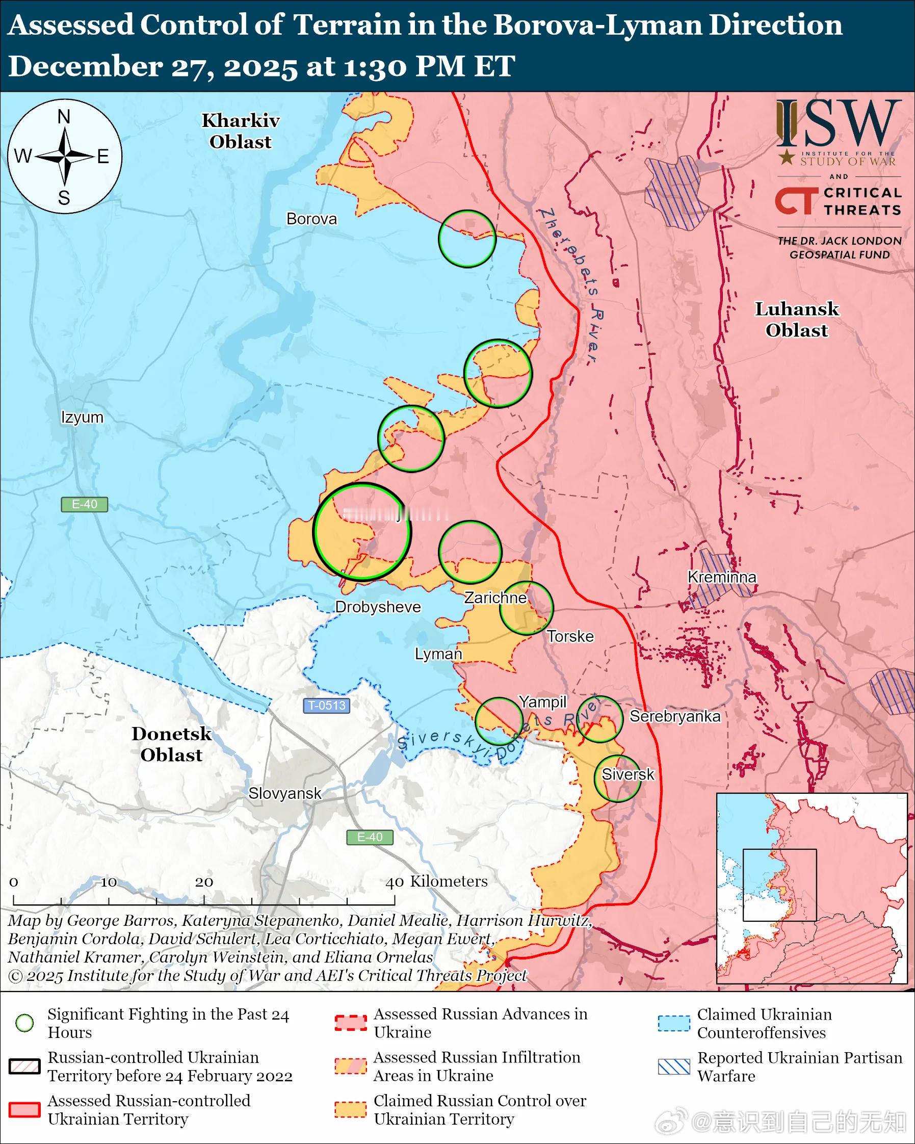 俄军主要行动2俄军目标:占领卢甘斯克州剩余部分,向西推进至哈尔科夫州东部,并包围顿涅茨克州北部。乌克兰军队最近向库皮扬斯克方向推进。12月26日和27日,俄军在库皮扬斯克附近及库皮扬斯克境内发动进攻;向库皮扬斯克以东的彼得罗巴甫洛夫卡方向进攻;并向库皮扬斯克东南的皮什恰内方向进攻。俄罗斯国防部和军事博客声称,乌克兰军队在库皮扬斯克、帕拉马里夫卡、莫纳奇尼夫卡(均位于库皮扬斯克西北部)、米罗韦、索博利夫卡(均位于库皮扬斯克西部)、布拉霍达季夫卡、普罗科皮夫卡、博尔德里夫卡(均位于库皮扬斯克西南部)、萨多韦、奥西诺韦和库皮扬斯克-武兹洛维(均位于库皮扬斯克南部)附近进行了反击。12月27日一名在库皮扬斯克方向作战的乌军旅发言人报告称,近期天气转晴后,俄军大幅增加了该地区的无人机机组数量,以应对乌克兰的反击。该发言人表示,俄军近期部署了隶属于苏多普拉托夫营志愿部队的“苏德尼登”部队的部分兵力,并增加了光纤无人机和“闪电”无人机的使用。发言人还表示,俄军的进攻次数有所减少,并且俄军正在奥斯基尔河东岸(左岸)后方集结兵力。一位俄罗斯军事博主兼前“风暴-Z”无人机教官指出,其他俄罗斯消息来源越来越多地报道称,库皮扬斯克方向的俄军无人机操作员正在持续不断地工作,没有休息时间。他认为,这表明俄军缺乏足够的无人机操作员来应对持续“相当长一段时间”的乌克兰反击。作战序列:据报道俄第 245 摩步团(第 47 坦克师,近卫坦克集团军 [GTA],莫斯科军区 [MMD])正在哈尔科夫方向作战。俄军继续在博罗瓦东北部的克鲁赫利亚基夫卡附近和新普拉托尼夫卡方向、博罗瓦东部的科潘基附近以及博罗瓦东南部的赫雷基夫卡、新沃沃迪亚内和新沃耶霍里夫卡附近和德鲁热柳比夫卡方向发动进攻,但在 12 月 26 日和 27 日没有取得进展。 12月27日俄军继续在斯拉维扬斯克-利曼方向发动进攻,但并未取得确切进展。未经证实的说法:一位俄罗斯军事博主声称,俄军沿着莱曼以北的 O0526 莱曼-德鲁热柳比夫卡公路和斯塔夫基东部(莱曼以北)推进。在莱曼方向作战的乌军旅发言人报告说,俄军的兵力比为 6 比 1 到 10 比 1。该发言人表示,俄军最近开始使用机械化装备,但仅用于运送步兵。俄军在莱曼城内及附近发动进攻;在莱曼城西北部的诺沃谢利夫卡、谢列德涅附近以及德罗比舍韦方向发动进攻;在莱曼城北部的里德科杜布、卡尔皮夫卡附近以及斯塔夫基方向发动进攻;在莱曼城东北部的科洛迪亚齐附近发动进攻;在莱曼城东部的扎里奇涅附近发动进攻。