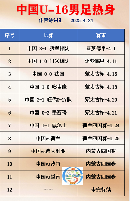 4月初,中国U-16男足在德国3-1战胜沃尔夫斯堡梯队,之后1-0战胜门兴梯队,然后转战法国、荷兰,参加蒙太古杯、荷兰杯等赛事,且从4月16号到4月25号的9天时间,中国U-16男足在欧洲两个国家安排了6场比赛,对手基本是世界强队。