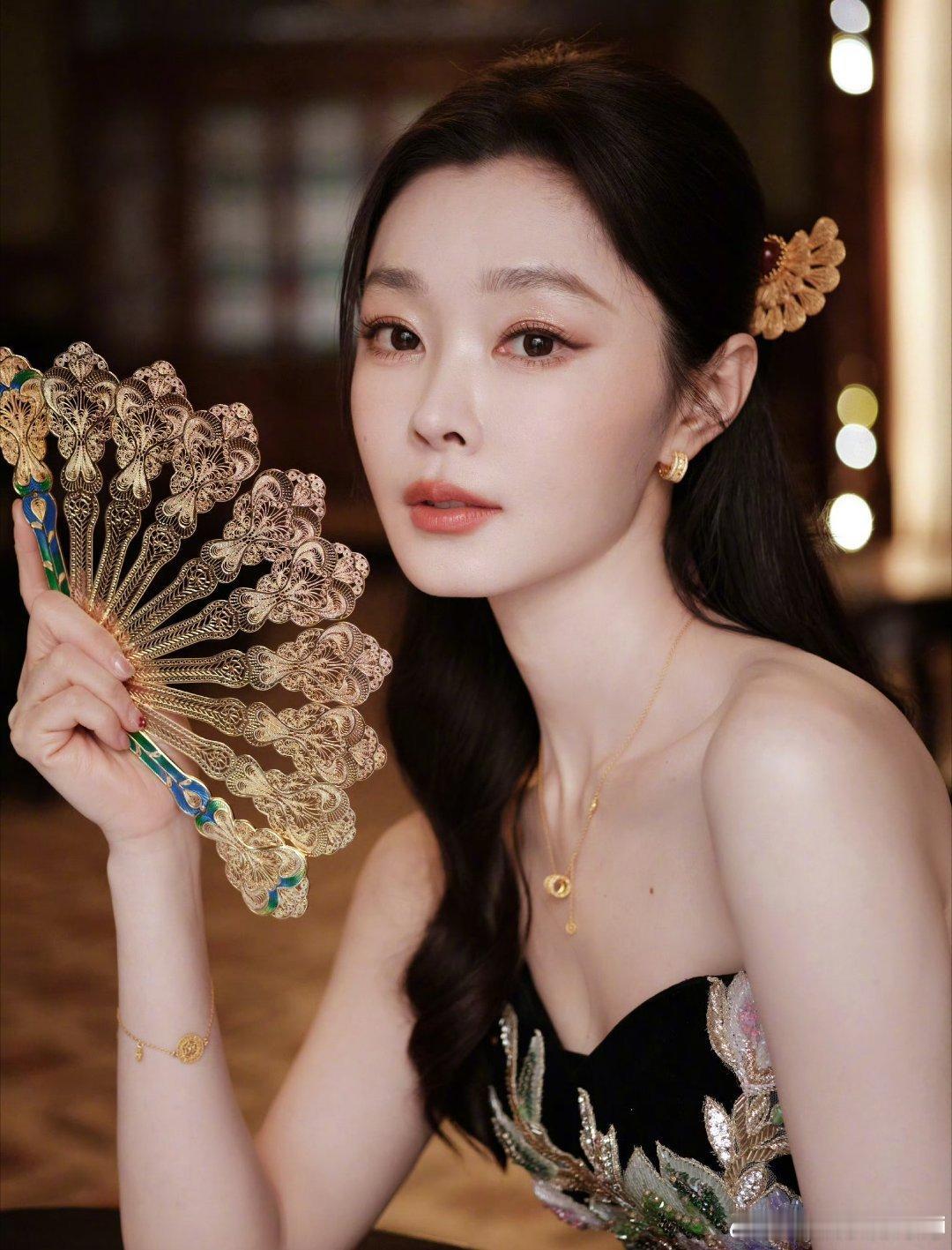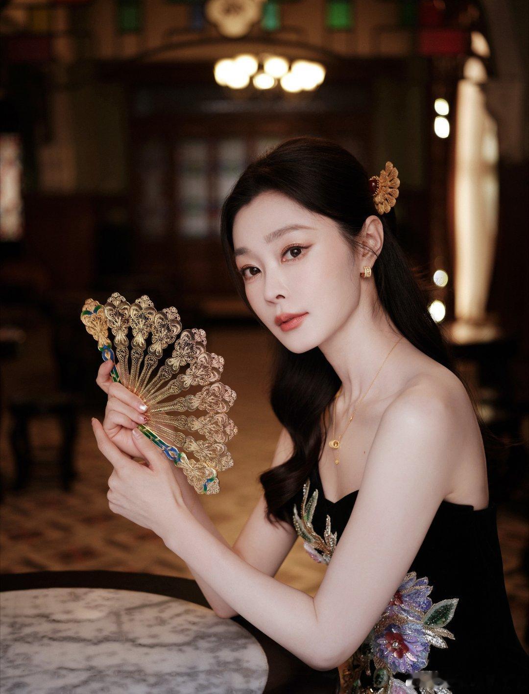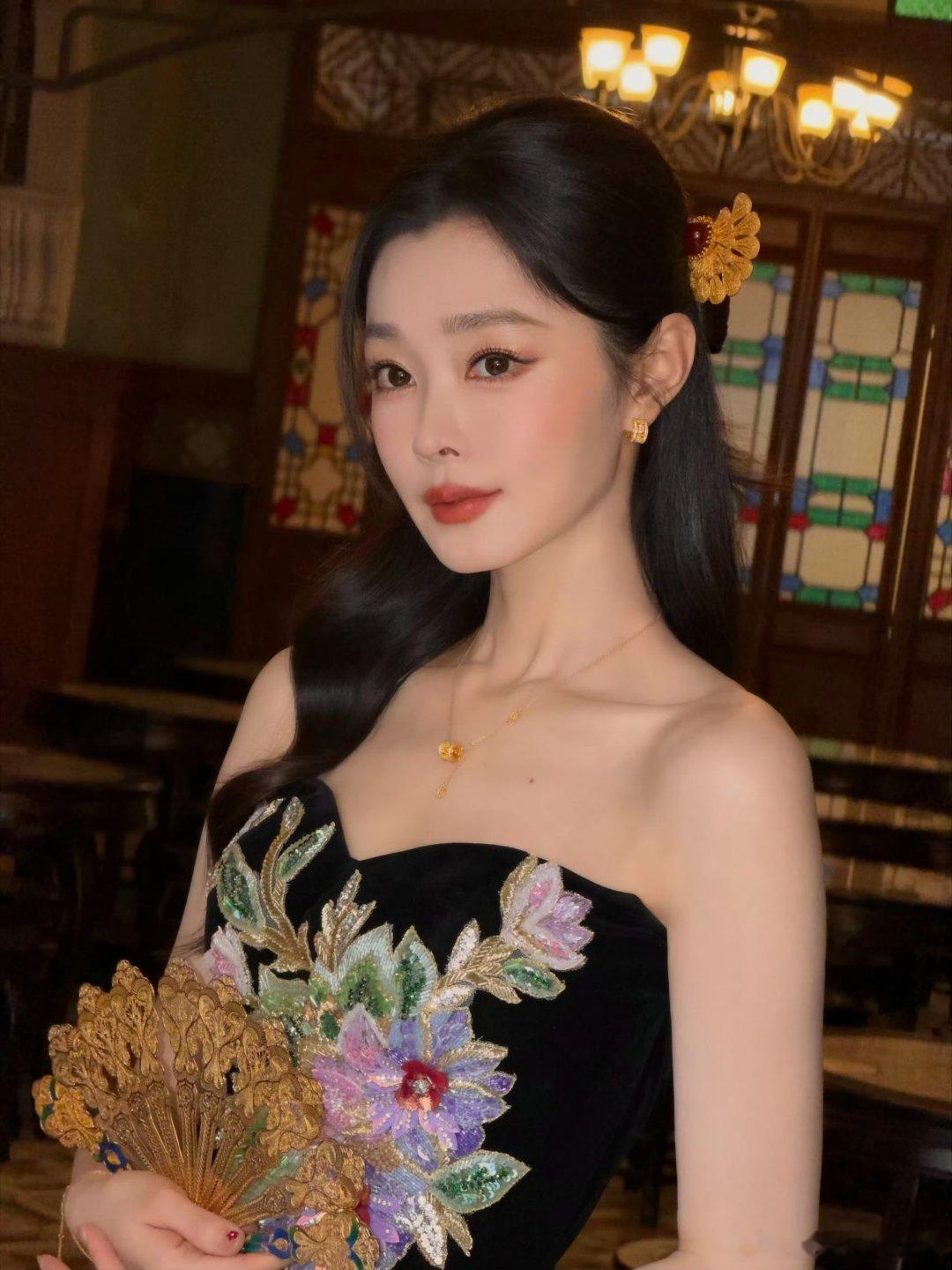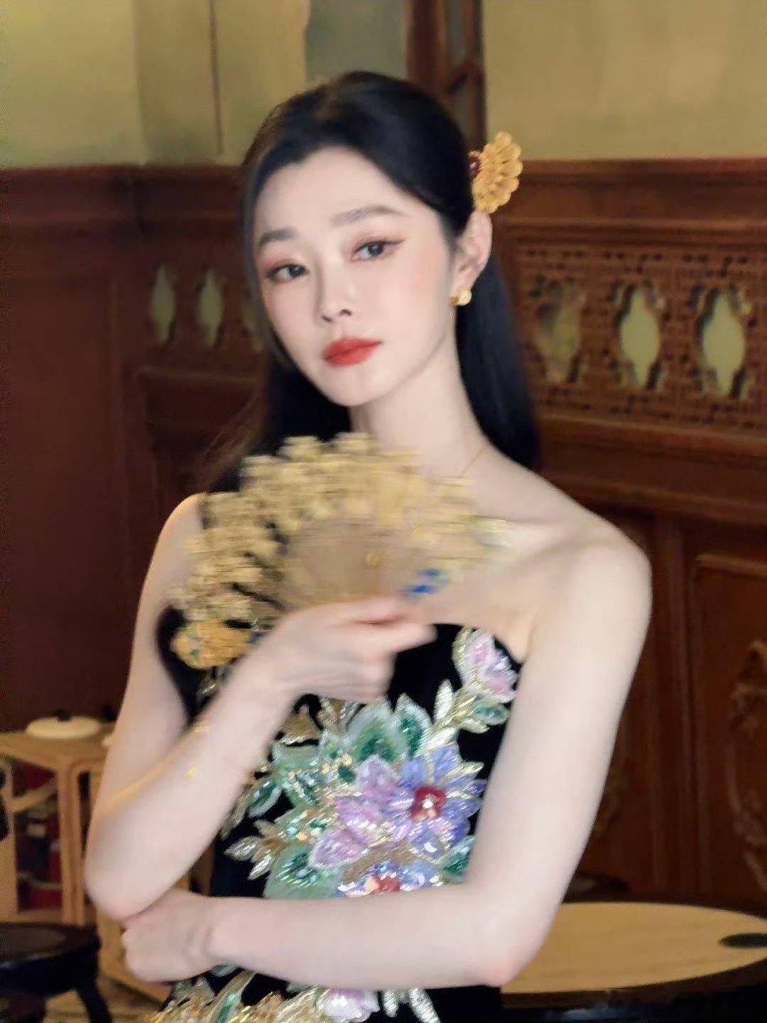 宋轶新中式美成啥样了 长发半扎温婉动人,黑金刺绣裙高级大气,金扇一握韵味立显。宋