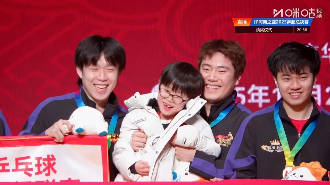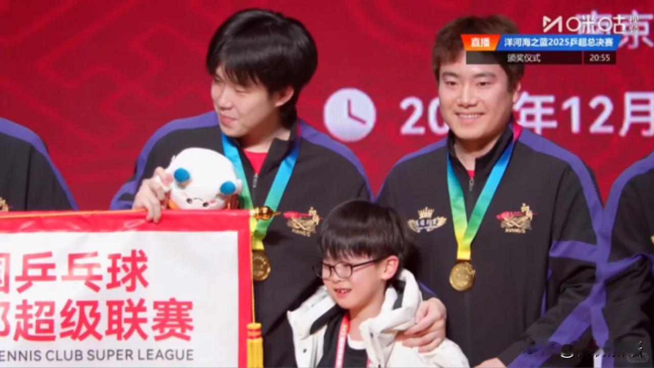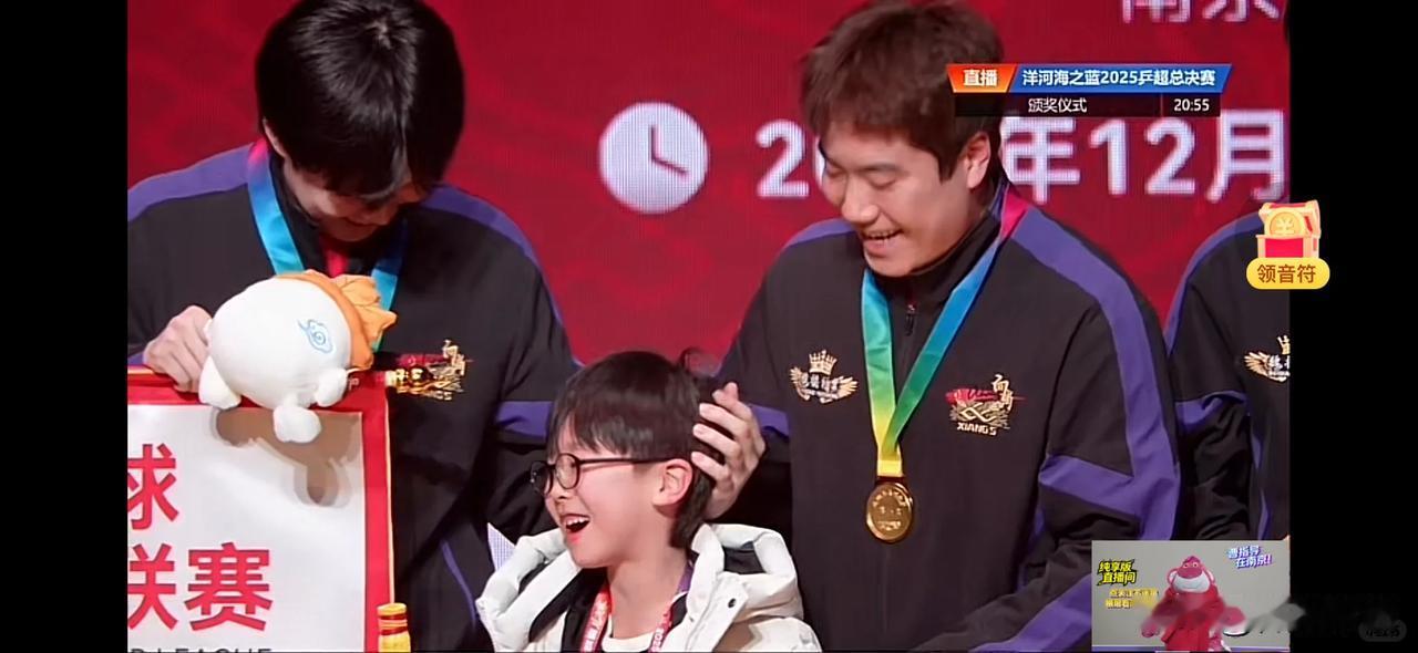 凉皮今晚又来当球童了。 这孩子今晚安静了很多,他坐在那里看爸爸比赛,还给爸爸鼓掌了,凉皮跑的也特别快,一下子就把球给捡回来了。估计昨晚大家觉得凉皮活泼好动,捡球的时候在那坐不住,今天妈妈应该给上课了,确实今晚乖了很多,不过男孩子嘛,就比较调皮,凉皮的性格挺好的。王楚钦和向鹏的比赛,看到也是凉皮在那里捡球了,这两天在南京,孩子是玩开心了,幸福啊! 恭喜山东魏桥夺得男团冠军,在颁奖结束时,看到凉皮也上台了,王楚钦是真的很喜欢孩子啊,看到凉皮后,还摸摸凉皮的头,估计凉皮回去就得发动态了:我和王。王楚钦一把把凉皮搂到他那里去了,这孩子真幸福。后面拍照的时候梁靖崑还把凉皮抱起来了,看把楚钦开心的,小林也投来了羡慕的目光。感觉王楚钦以后一定也是个好爸爸,他每次看到小朋友时,眼神都特别的温柔。 这次南京之旅他们都很开心啊,凉皮估计和妈妈他们连夜就回北京了吧,回去还能赶上明天上学,孩子也不容易啊。不过去到学校可以和小朋友聊一聊这两天在南京的趣事儿,说不定还有同学在电视上看到凉皮了呢。