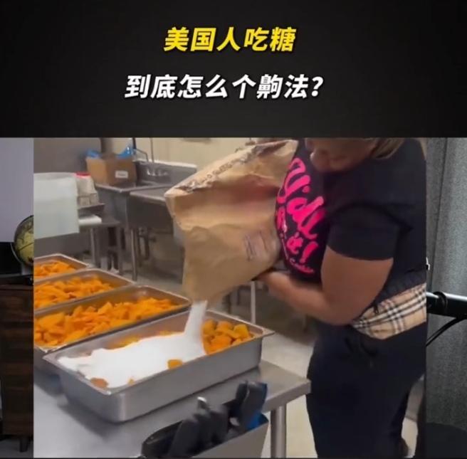 美国人超喜欢甜食。 (图一)蜜雪冰城在美国纽约时代广场开设第一家门店,推出糖度为200%的奶茶,还是被美国人觉得不够甜。 (图二)从美国人制作糕点的视频来看,是拿一大袋子糖都倒上去,白花花地铺了一厚层,按中国人的口味,这属于齁甜。