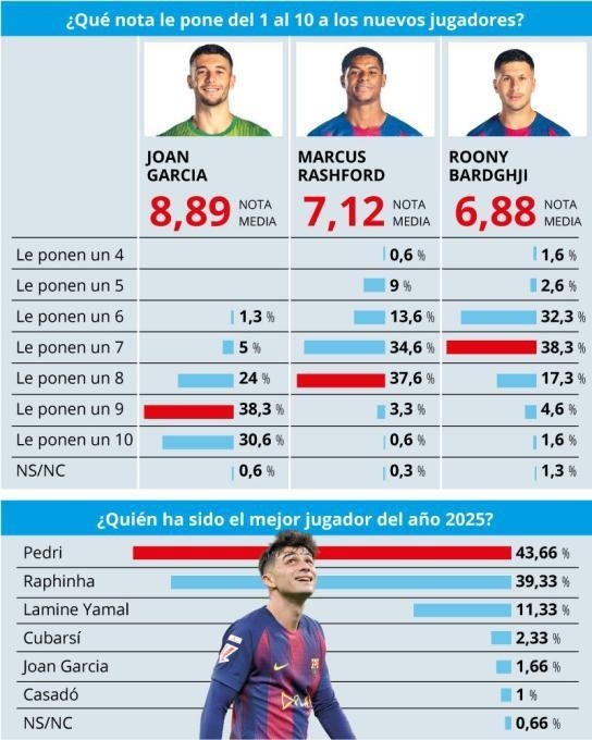 直播吧12月28日讯西班牙《世界体育报》调查了巴萨球迷,统计了2025年他们心目中俱乐部的最佳引援和最佳球员,霍安·加西亚和佩德里分别当选。