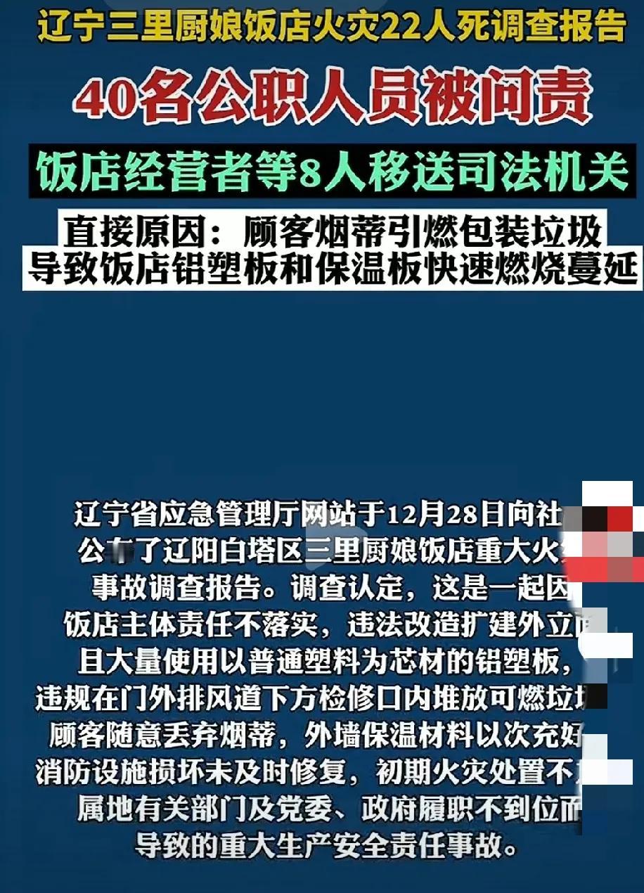 40人被问责 太惨了!这么多人伤亡,一定要严惩不怠,决不姑息养奸,给老百姓一个交代! 据报道,事故处理中,8名相关责任人被移送司法机关,同时40名公职人员因履职不到位被追责问责,反映出对监管失职的严肃态度。 首先,事故教训深刻的:一是生产经营单位重效益轻安全,二是监管部门存在“只管合法、不管非法”的盲区,三是风险防范意识不足。国务院安委会对事故查处实行挂牌督办,凸显了对重大安全责任事故的零容忍。 其次,这起事故再次敲响警钟,安全生产需压实各方责任,杜绝侥幸心理,尤其对人员密集场所的消防隐患必须动态清零。
