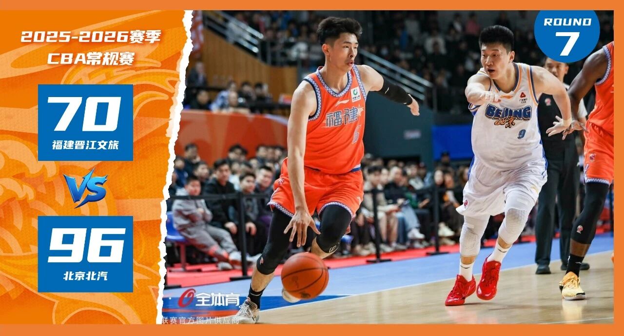 2025-2026赛季CBA常规赛第7轮焦点战在祖昌体育馆打响,福建晋江文旅男篮坐镇主场迎战开局六战全胜的北京北汽男篮。尽管主队首节打出惊艳表现,限制北京北汽男篮单节仅得9分,并领先8分进入第二节,但第二、第三节主队未能顶住对手的强势反扑,最终以70-96不敌北京北汽男篮,未能延续上轮击败广州的胜势。四节比分分别是:17-9,10-31,20-31,23-25(福建晋江文旅男篮在前)。