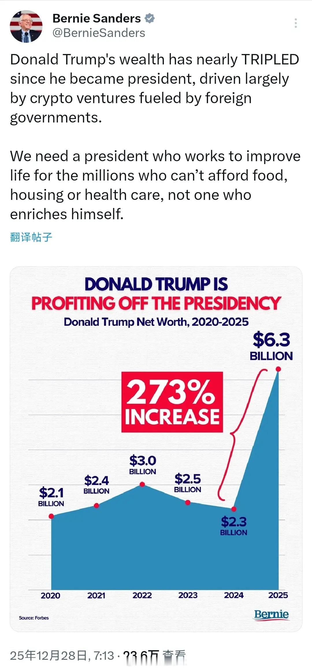 美国民主党籍参议员伯尼·桑德斯今天(北京时间12月28日)发文写道:“自唐纳德·特朗普担任总统以来,他的财富几乎增长了三倍,这主要得益于由外国政府资助的加密货币业务的推动。我们需要一位致力于改善那些无法获得食物、住房或医疗保障的数百万民众生活的总统,而不是一位只想着让自己富裕起来的总统。”评几句:特朗普这财富增长简直是美国政治圈的“奇闻丑剧”。特朗普财富自担任总统以来增长273%,这一情况在美国引发了广泛且激烈的争议。民主党籍参议员伯尼·桑德斯直言,其财富增长主要得益于外国政府资助的加密货币业务推动,这无疑让争议的火苗烧得更旺。这不是明目张胆的利益输送、权力变现吗?在美国,民众生活面临诸多困境,数百万民众连基本的食物、住房和医疗保障都难以获取,而特朗普却在这期间实现财富大幅跃升,二者形成鲜明对比。在明年中期选举前,这一敏感话题极有可能成为焦点,引发更多争议。美国民众必然会思考,总统的职责究竟是致力于改善民生,还是为自己谋取私利。