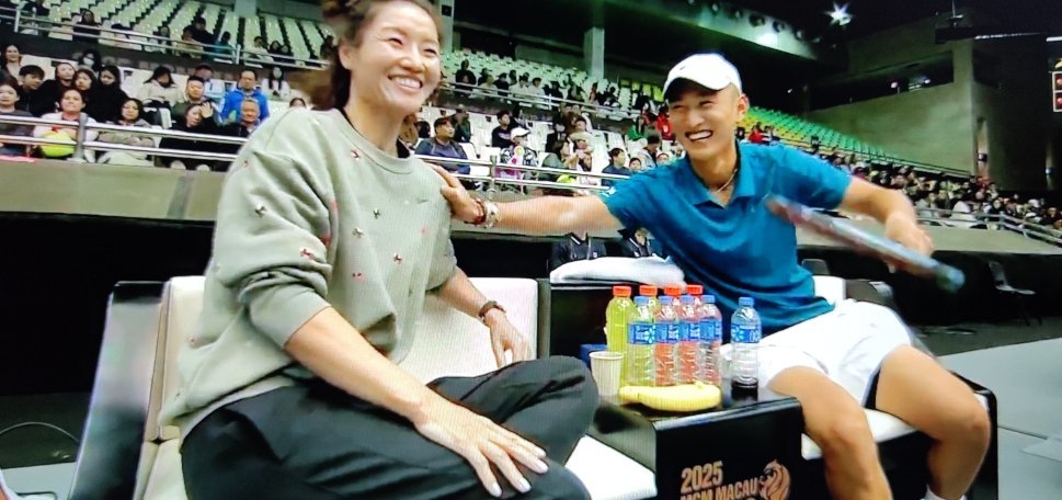 美高澳门网球名人赛,李娜与商竣程在局休期间谈笑风生,李娜担任教练,她的队员将对阵