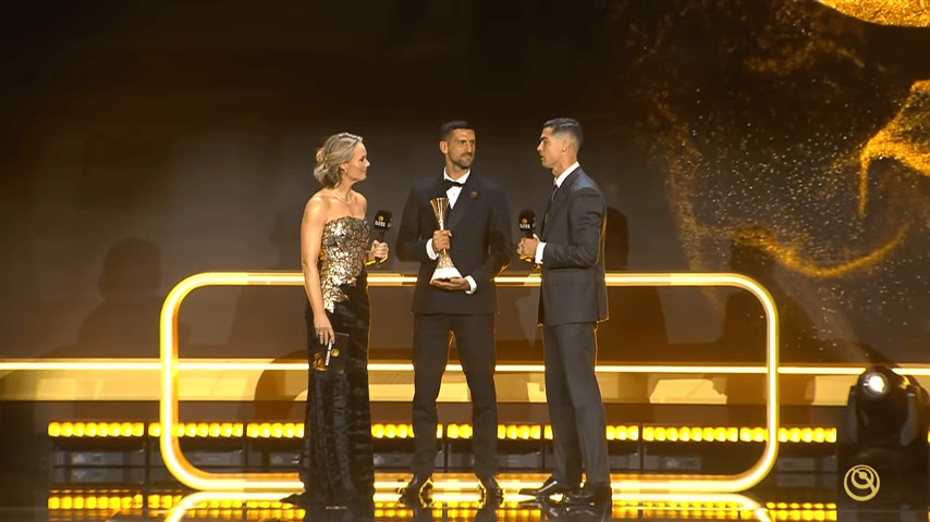 首届“环球体育奖”获奖者是塞尔维亚网球巨星诺瓦克-德约科维奇,由C罗向其颁奖。