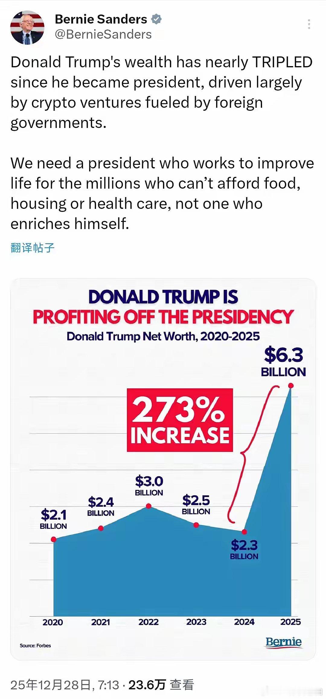 美国民主党籍参议员伯尼·桑德斯今天(北京时间12月28日)发文写道:“自唐纳德·特朗普担任总统以来,他的财富几乎增长了三倍,这主要得益于由外国政府资助的加密货币业务的推动。我们需要一位致力于改善那些无法获得食物、住房或医疗保障的数百万民众生活的总统,而不是一位只想着让自己富裕起来的总统。”[机智]评几句:特朗普这财富增长简直是美国政治圈的“奇闻丑剧”。特朗普财富自担任总统以来增长273%,这一情况在美国引发了广泛且激烈的争议。民主党籍参议员伯尼·桑德斯直言,其财富增长主要得益于外国政府资助的加密货币业务推动,这无疑让争议的火苗烧得更旺。这不是明目张胆的利益输送、权力变现吗?在美国,民众生活面临诸多困境,数百万民众连基本的食物、住房和医疗保障都难以获取,而特朗普却在这期间实现财富大幅跃升,二者形成鲜明对比。在明年中期选举前,这一敏感话题极有可能成为焦点,引发更多争议。美国民众必然会思考,总统的职责究竟是致力于改善民生,还是为自己谋取私利。