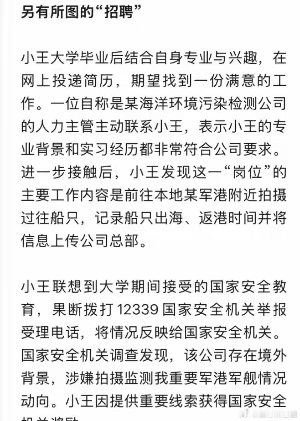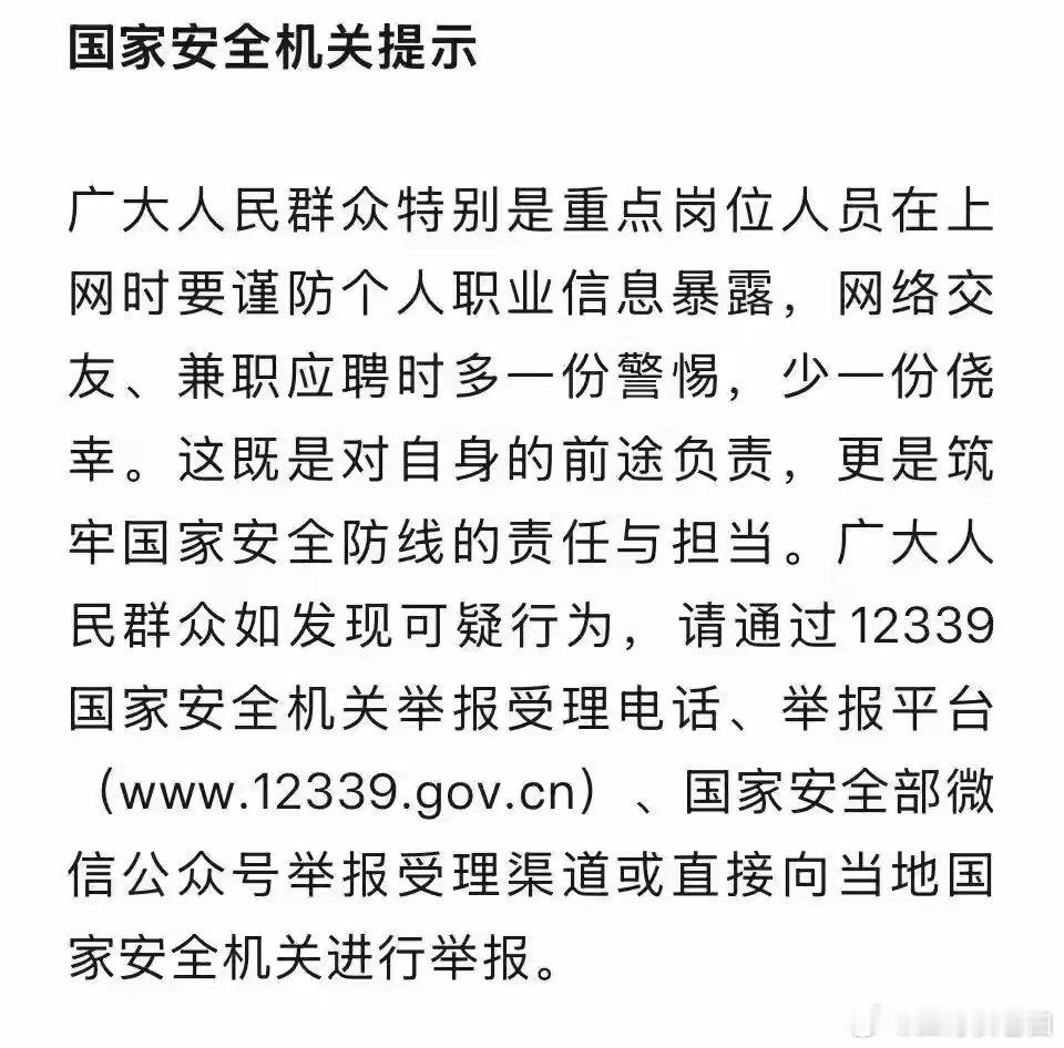 退伍军人赵某经常在社交平台发布着军装照片,被境外人员盯上以高额“报酬”收买,多次“泄密”军队内部信息12月28日,国家安全部发文《看似“宝藏网友”,实则“窃密黑手”》,详情如下:在数字空间的深处,与你彻夜畅谈的“宝藏网友”,或许正在编织一张温柔的陷阱。当“生财之道”“高薪兼职”“网络情缘”突然降临,你能否识破背后的窃密黑手?心怀鬼胎的“网友”小李为某涉军单位工作人员,偶然在交友软件上结识了网友小A,因其头像照片青春靓丽、言谈热情大方,小李对她产生了好感。随着接触深入,小A主动表示自己身边的朋友一直想找军人男友,希望能将小李介绍给自己的朋友。小李回想起先前聊天中,小A也曾多次试图打听自己单位内部情况,意识到自己可能遭遇境外间谍情报机关人员,小李果断中止了与小A的联系,并将情况反映给国家安全机关。经国家安全机关调查,小A等账号实为境外间谍情报机关设置的网络陷阱,意图策反我境内人员,窃取重点单位敏感信息。小心网络“假面”陷阱,守住信息安全防线