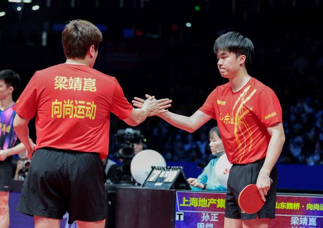 新华社照片,南京,2025年12月27日12月27日,山东魏桥·向尚运动队组合梁靖崑(前左)/林昀儒在双打比赛获胜后庆祝。他们3比0战胜上海地产集团队组合周恺/孙正。新华社发(刘臻睿摄)