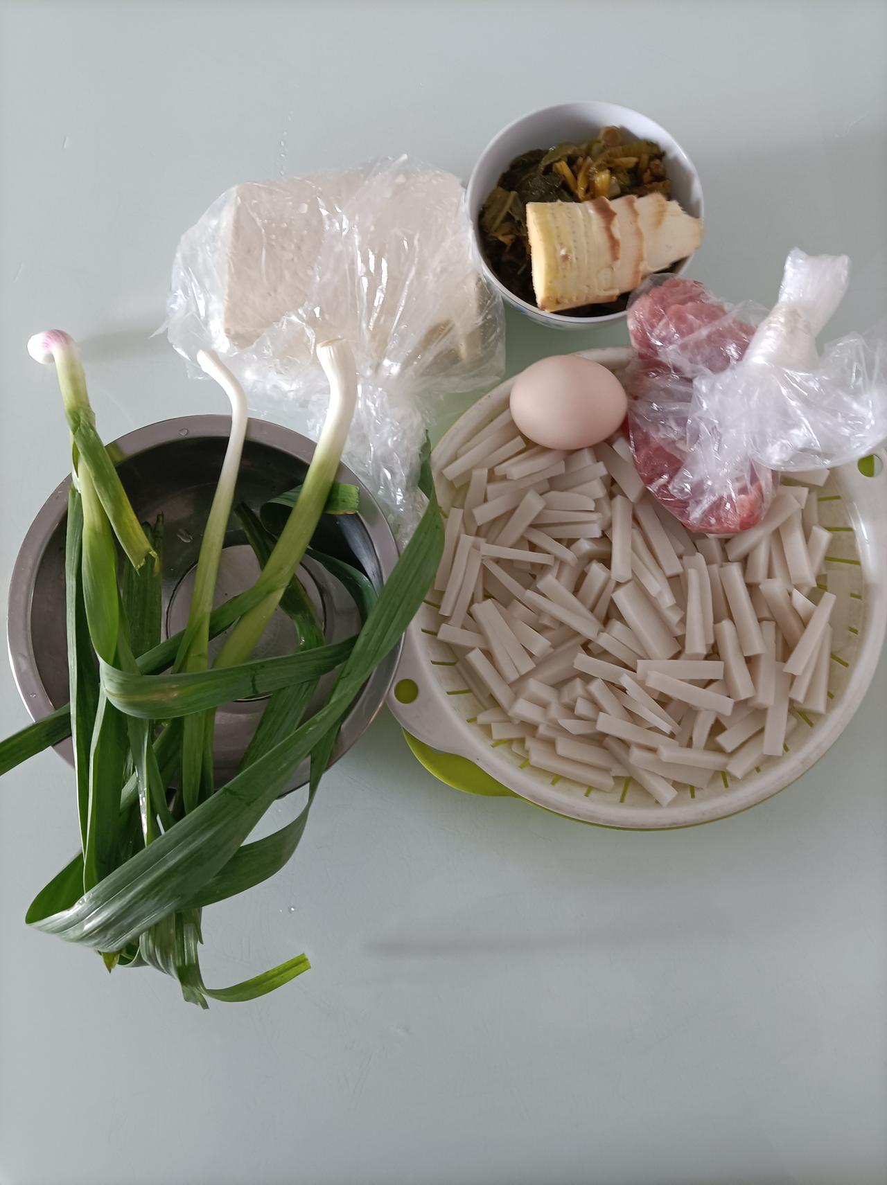 新年从一顿美食开始我儿子周末做的家乡炒年糕,配了冬笋,豆腐,鸡蛋,咸菜,瘦肉,味