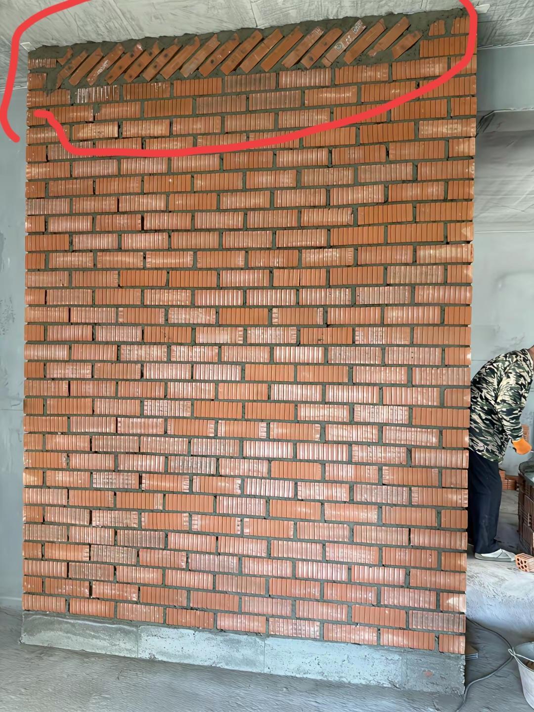 家里搞装修,请了个乡下的师傅,砌的这墙实在是让我看不懂了!最上面那一排砖为何要这样斜着砌呢?有没有懂行的老师傅,帮看看,他这操作正常吗?[what]