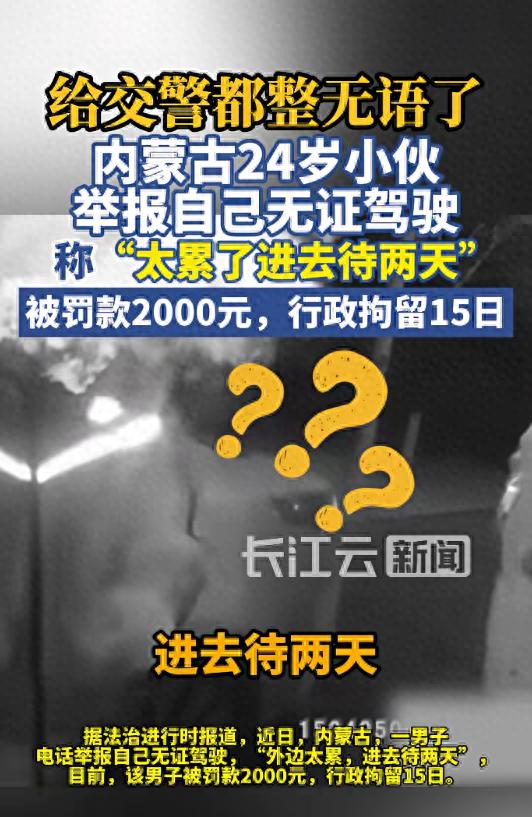 12月28日,据媒体报道,内蒙古一24岁男子打电话举报自己无证驾驶,理由是:“外边太累,进去待两天”,最终该男子被罚款2000元,行政拘留15日。