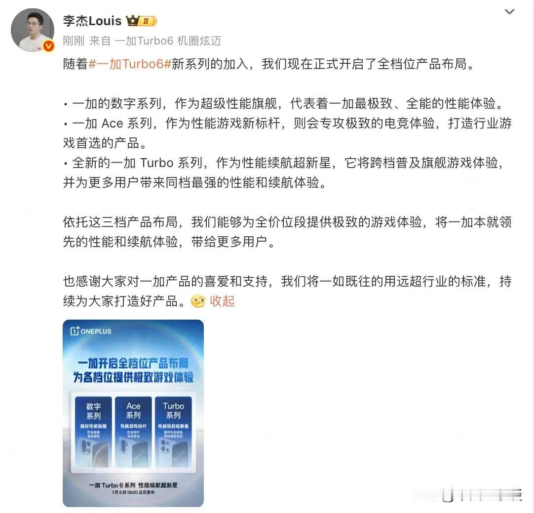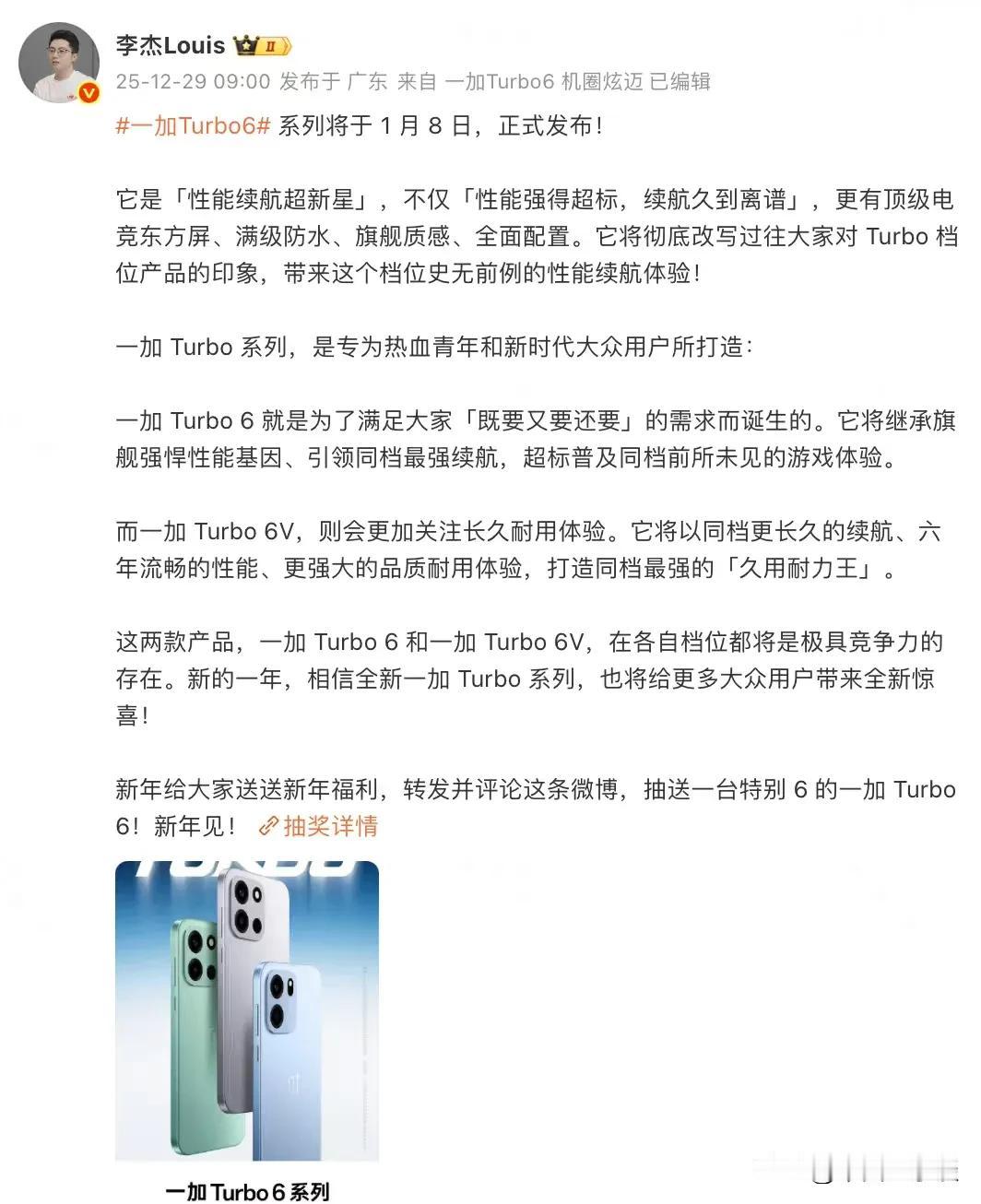 一加 Turbo 6系列,一加称之为性能续航超新星,正式官宣定档1月8号晚上7点发布。性能+续航是一加为Turbo系列重点打造的模块,相信会带来同档最强的性能续航体验。 一加目前拥有数字、Ace、Turbo系列全档位、全价位段产品布局。