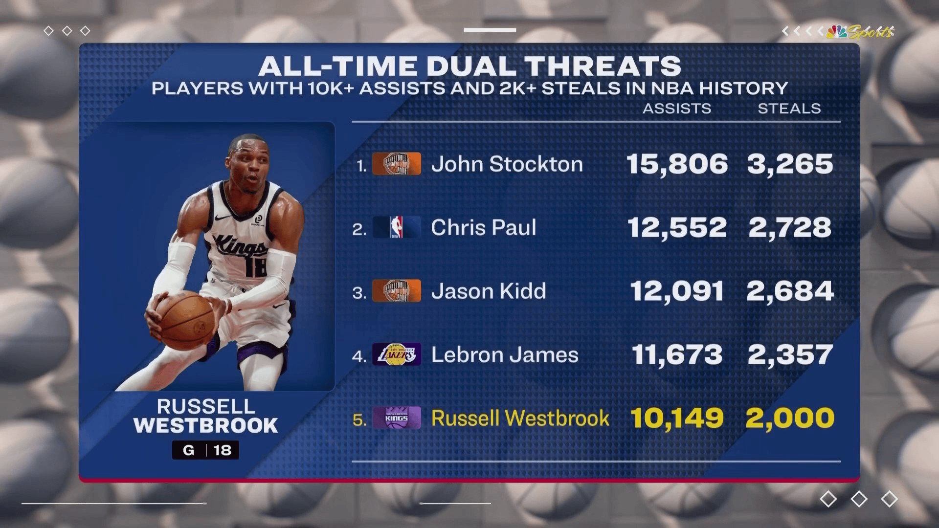 赛季官方晒住数据,威少成为历史第五位生涯送出10000助攻和2000抢断的球员。