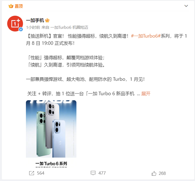 2025年12月29日,@一加手机正式官宣全新Turbo系列手机将于2026年1月8日19:00发布,该系列包含一加Turbo6与一加Turbo6V两款机型,定位“性能续航超新星”,官方宣称将以“性能强得超标,续航久到离谱”的表现,改写Turbo档位产品的行业印象,为用户带来史无前例的体验。
