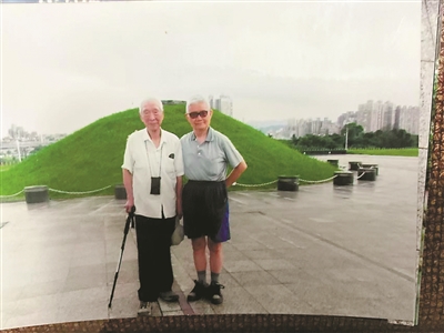 2014年6月,陈纲(右)在台北马场町纪念公园凭吊烈士。