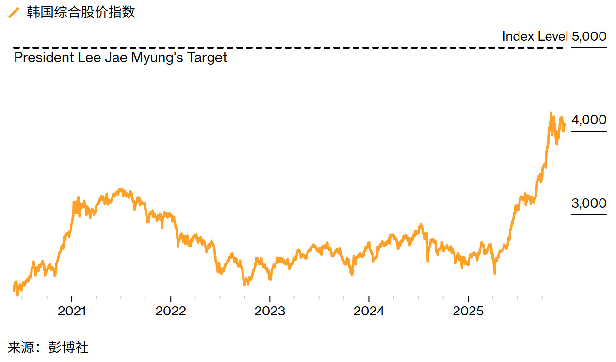 韩剧靠边。论反转与刺激,2025年韩国股市才是头号主角。受总统李在明(LeeJaeMyung)“资本市场振兴”政策助推,基准股指截至12月22日年内狂飙逾70%,直奔他竞选时就喊出的“Kospi5000”目标,轻松领跑全球主要股指。